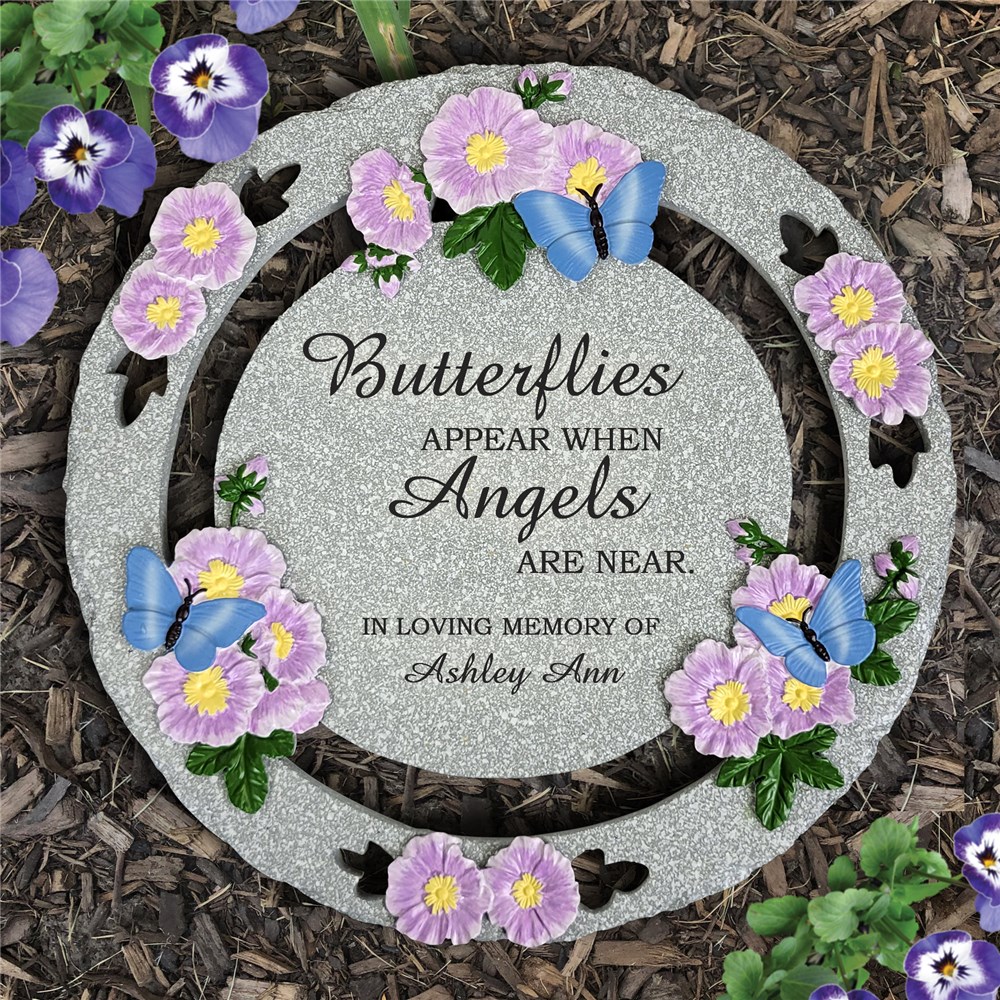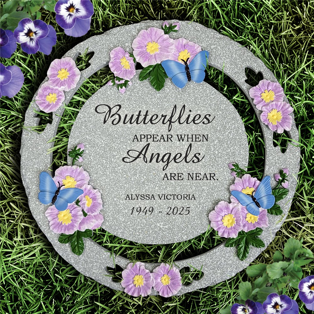 Honor the memory of a loved one with our beautifully crafted Engraved Butterflies Appear Memorial Butterfly Garden Stone. Adorned with delicate purple flowers and serene blue butterflies, this elegant stone features a comforting phrase. Beneath the message, you can personalize two lines with your choice of text - whether it's a name, memorial dates, or a custom sentiment.