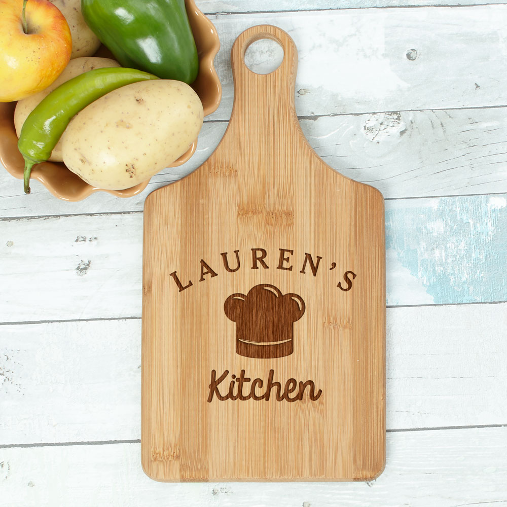 Create a cute and personalized engraved chef hat paddle cutting board for the chef in your life to display in their kitchen.