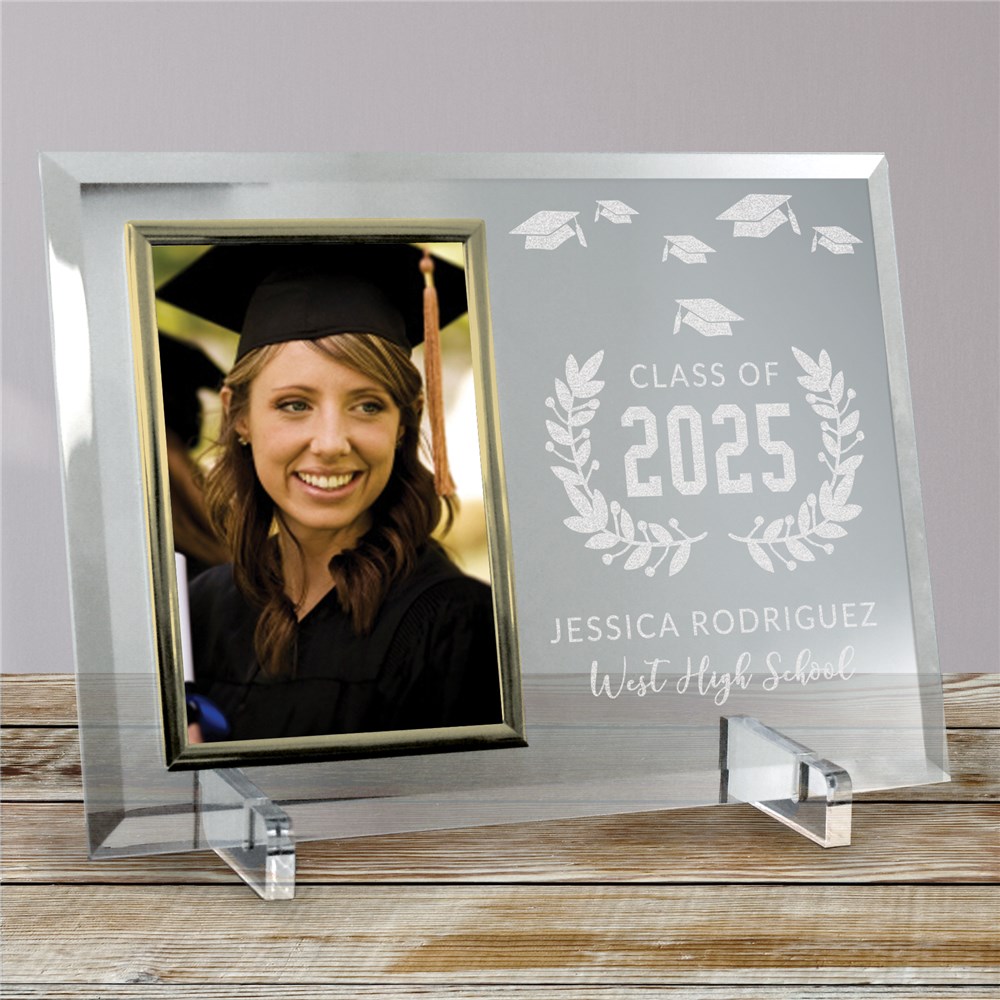Always remember graduation day with our Engraved Class Of with Hats & Floral Glass Frame.