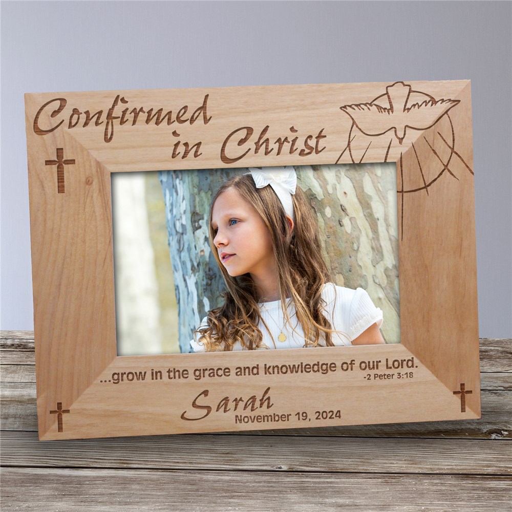 A child's confirmation is a sacred time. These engraved Confirmation personalized wood picture frames are a way to remember the blessed event forever. Your Confirmation personalized wooden picture frames read Confirmed in Christ and will be beautifully engraved with your child's name (up to 30 characters) and the date of the momentous occasion. This personalized Confirmation frame — which is available in a horizontal or vertical design and your choice of three sizes (4" x 6, 5" x 7" and 8" x 10") — includes an easel back for tabletop display.