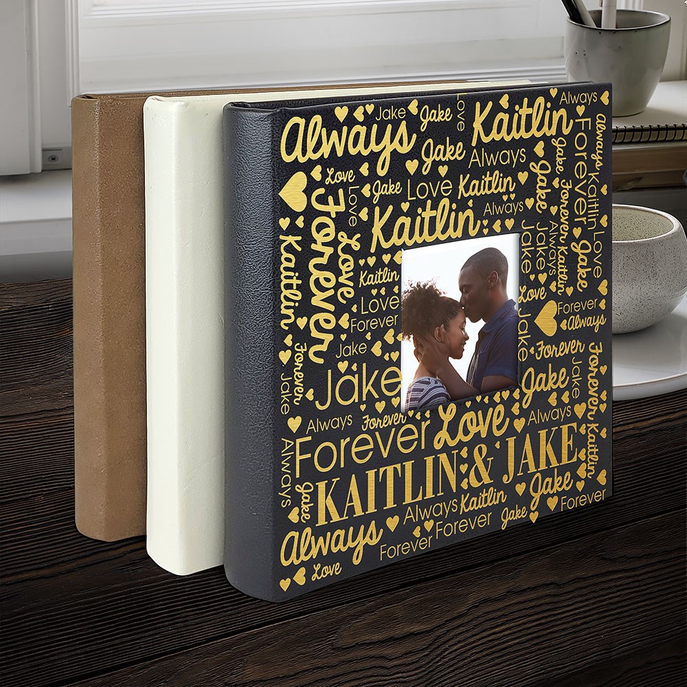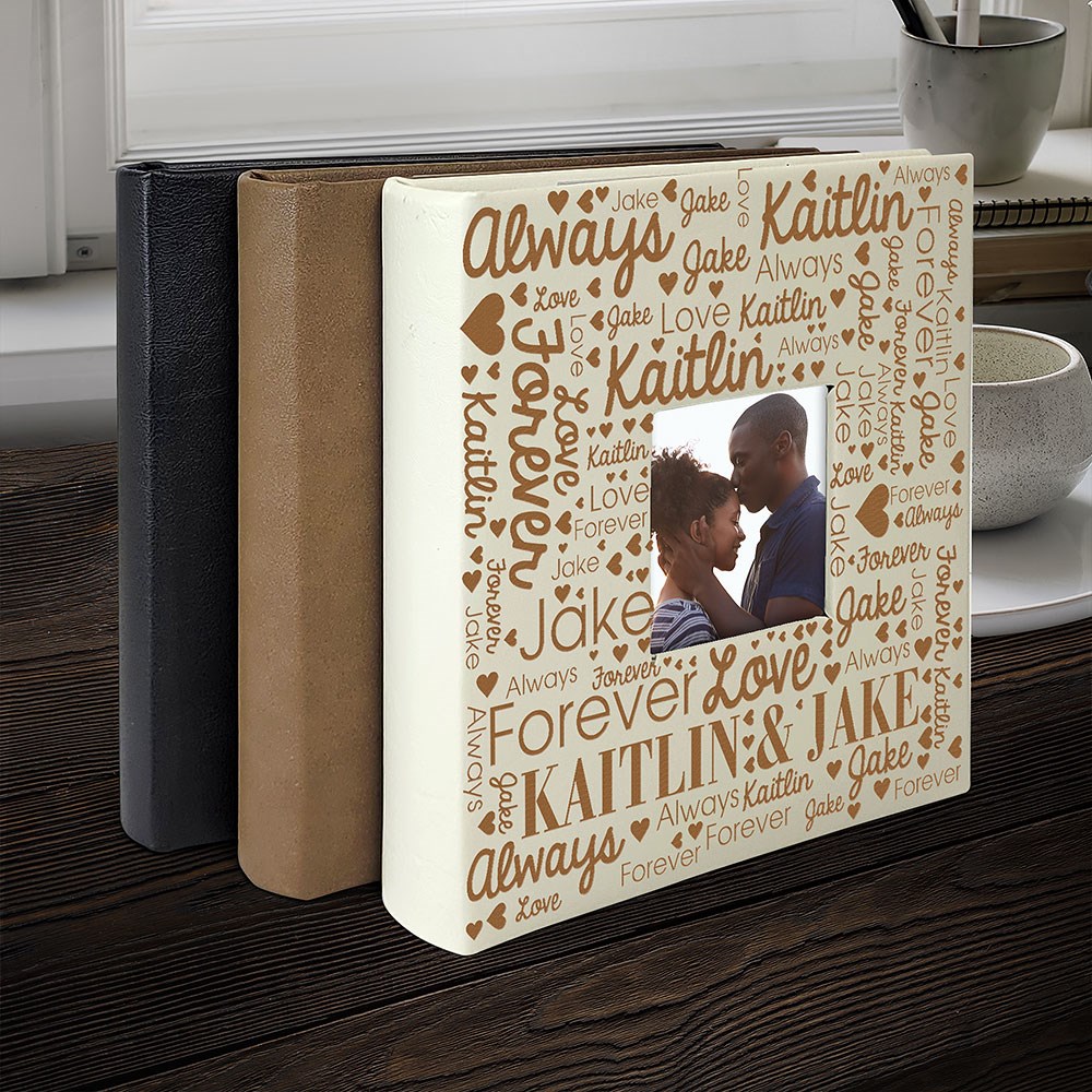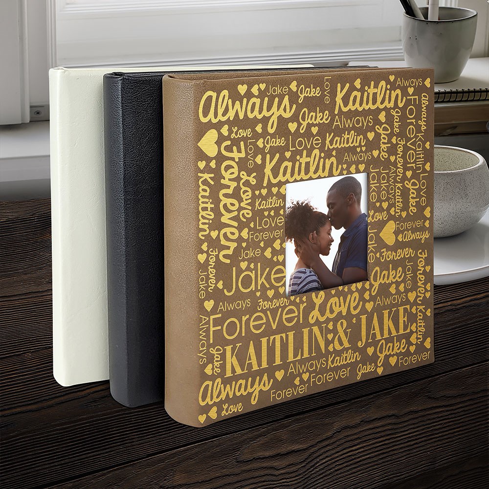 Capture your love story in style with this Engraved Couples Word Art Leatherette Photo Album.