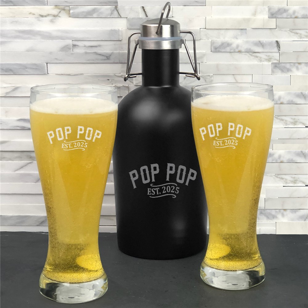 This 3 piece set includes our generously sized black stainless steel growler and 2 pilsner glasses, all personalized with any title and year.