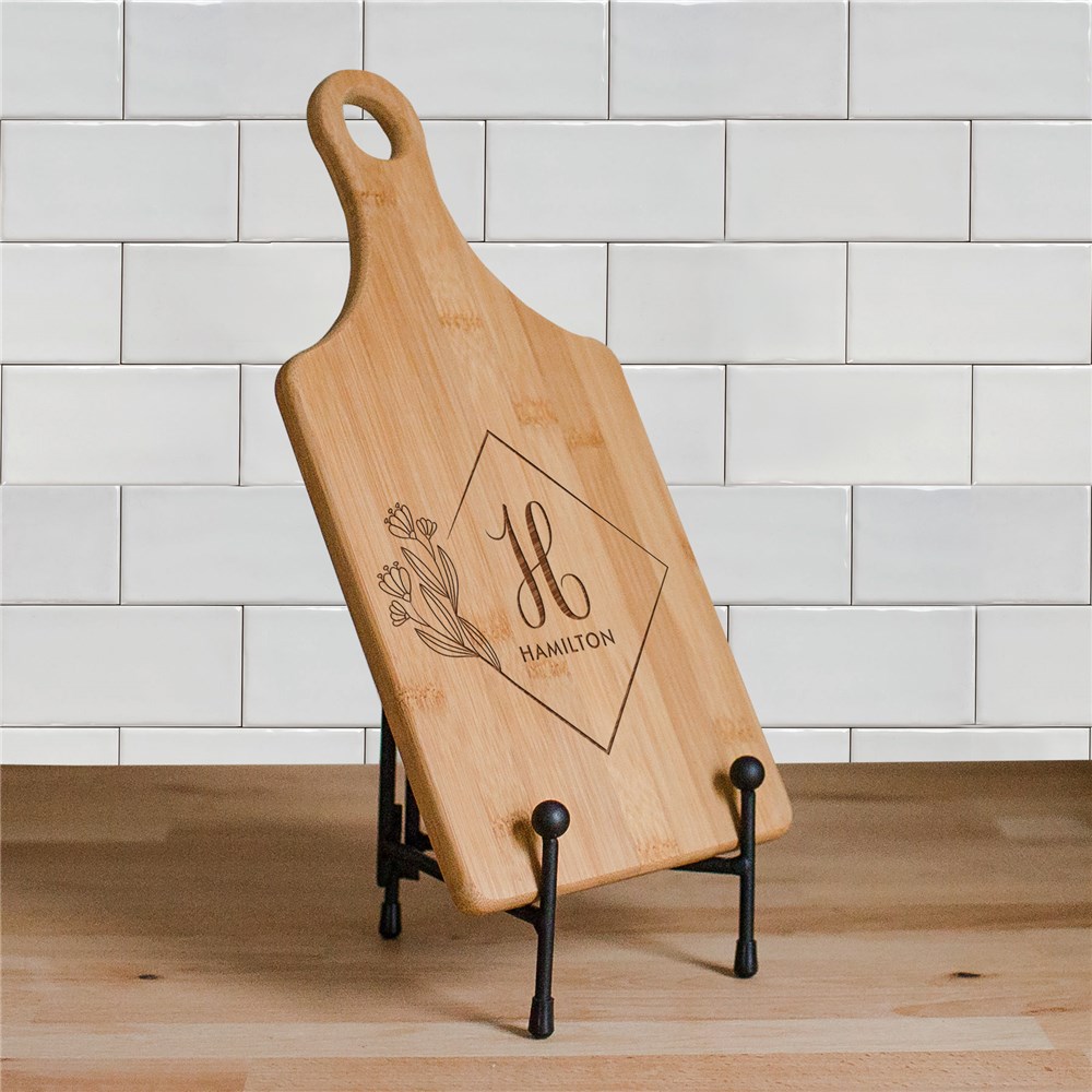 Our Engraved Diamond Frame Initial Paddle Cutting Board makes a unique and functional decor piece for any kitchen.