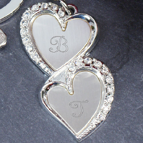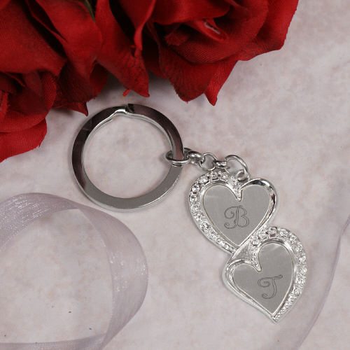 Double Heart Key Chain - Engraved Double Heart Silver Key ChainThis Silver-Plated Double Heart Key Chain will remind her of you each time she reaches for her keys. Engraved with both your initials and hers, these pretty keychains make Personalized Valentine’s Day Gifts or another special occasion. Our Engraved Silver-Plated Double Heart Key Chain with glistening cubic zirconia accents measures 1 " x 2 3/4". Engraved keychain includes free engraving. Personalized your Heart Silver Keychain with any two initials.