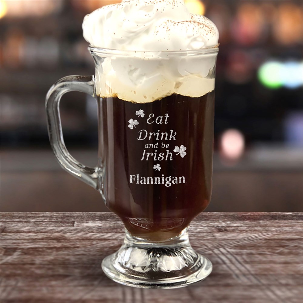 Proudly show off your Irish heritage with our Engraved Eat Drink Be Irish Irish Coffee Mug.