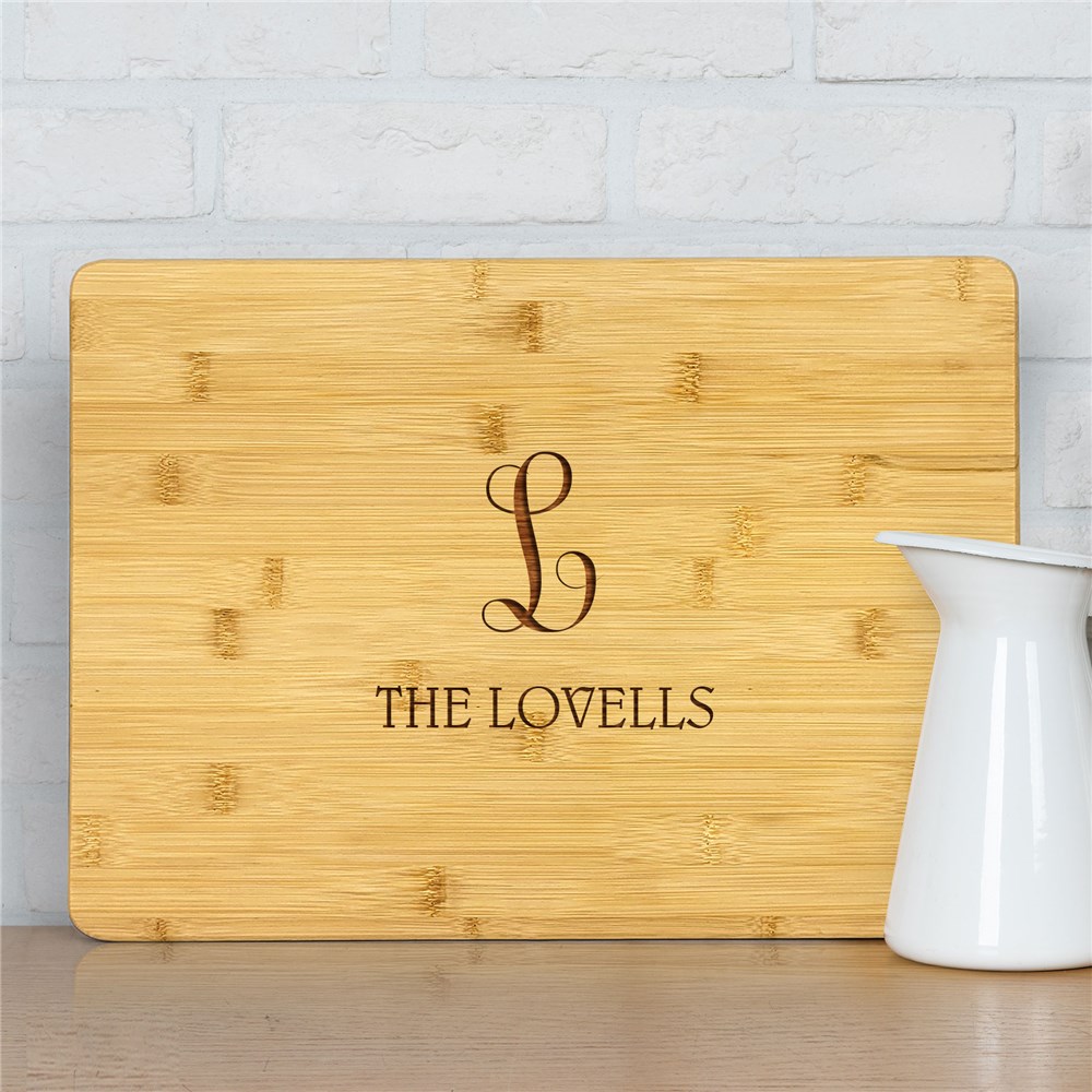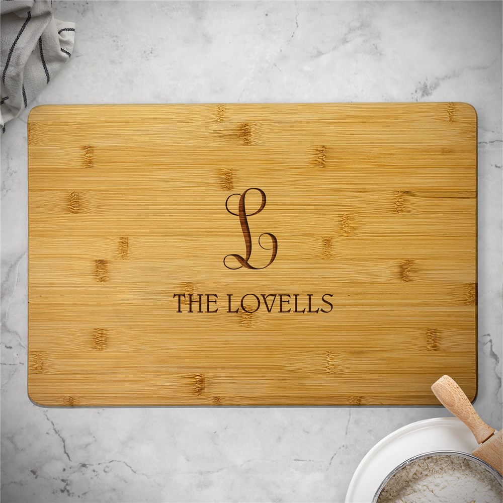 Celebrate family traditions and add a touch of elegance to your home with this Engraved Family Name and Initial Bamboo Cutting Board.