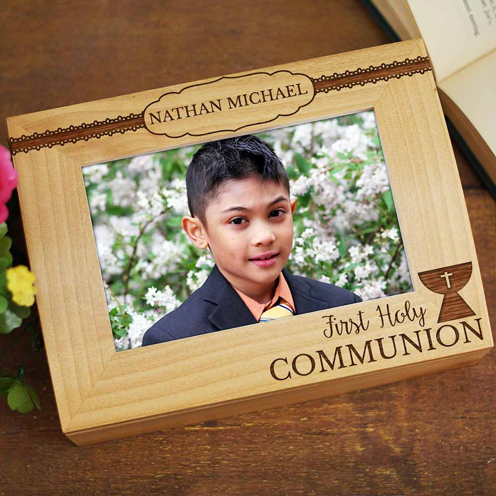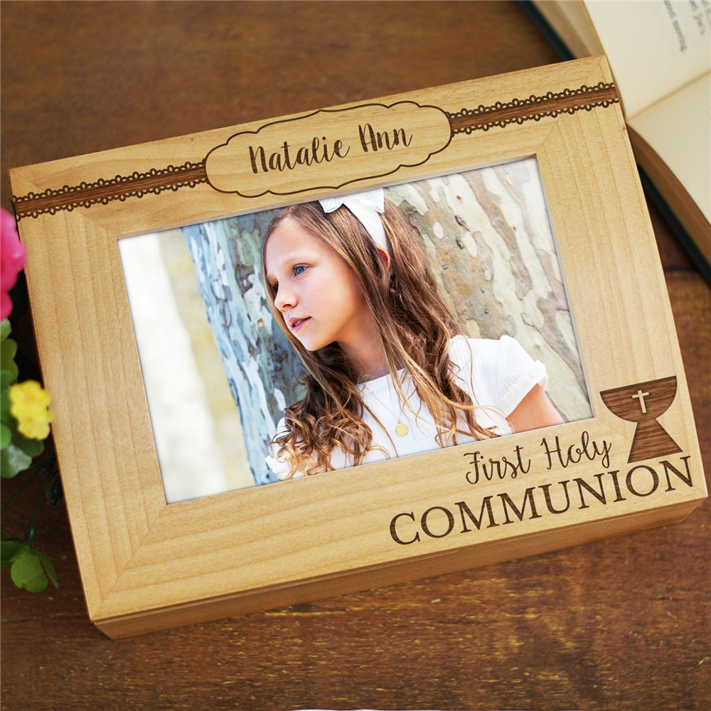 A photo from your child's First Holy Communion will look adorable nestled inside these personalized wood keepsake box. This box can be personalized with any name and font option of block or script. This box is a special keepsake that you and your family will cherish for a lifetime!