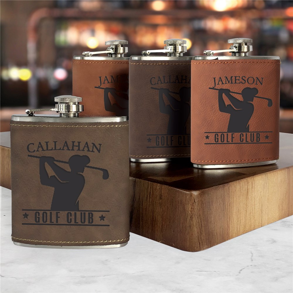 Engraved Golf Silhouette Club Name Leatherette Flask