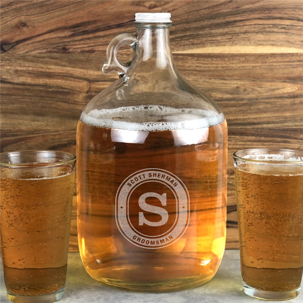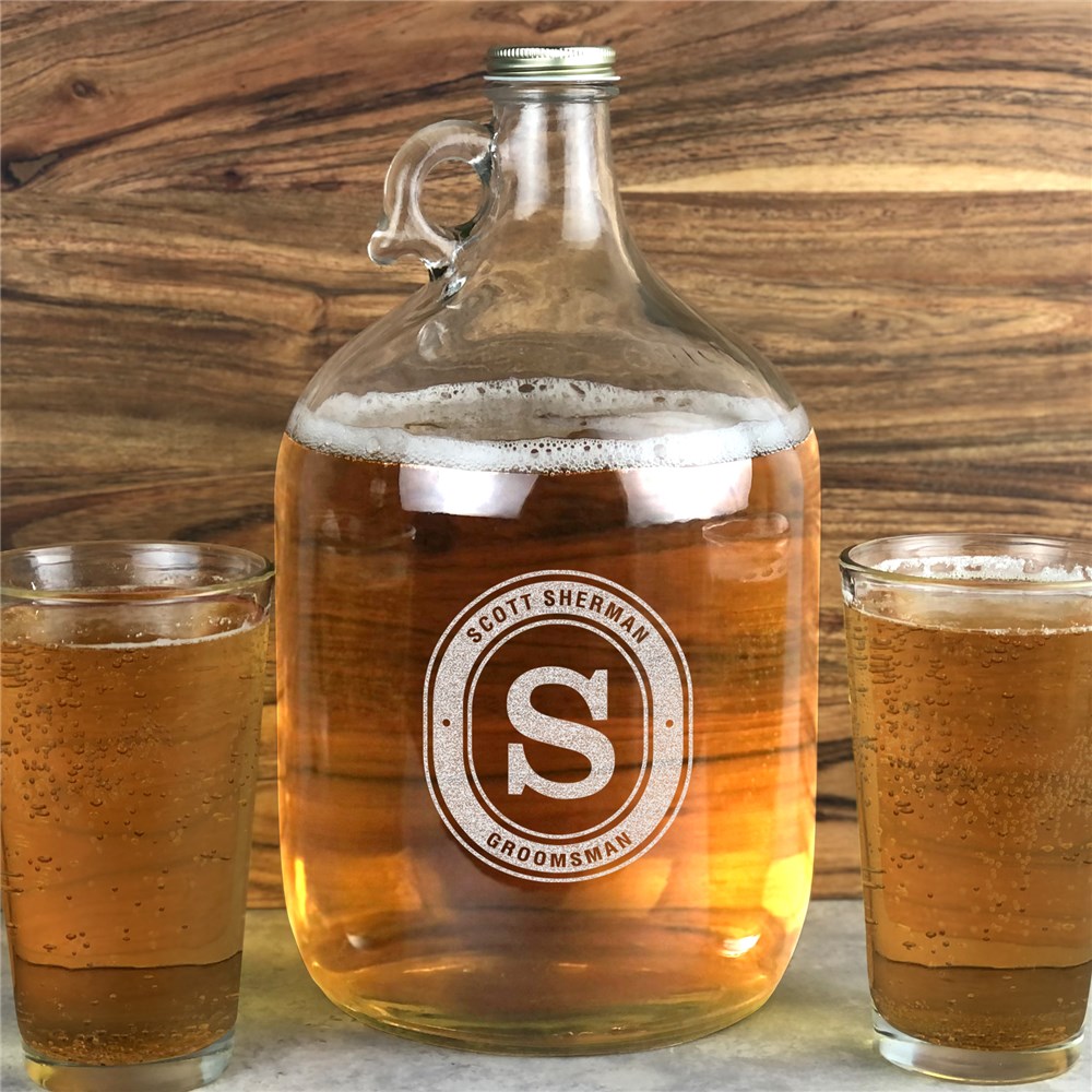Celebrate this happy occasion with your closest friends and family with our Engraved Groomsmen Initial Glass Growler
