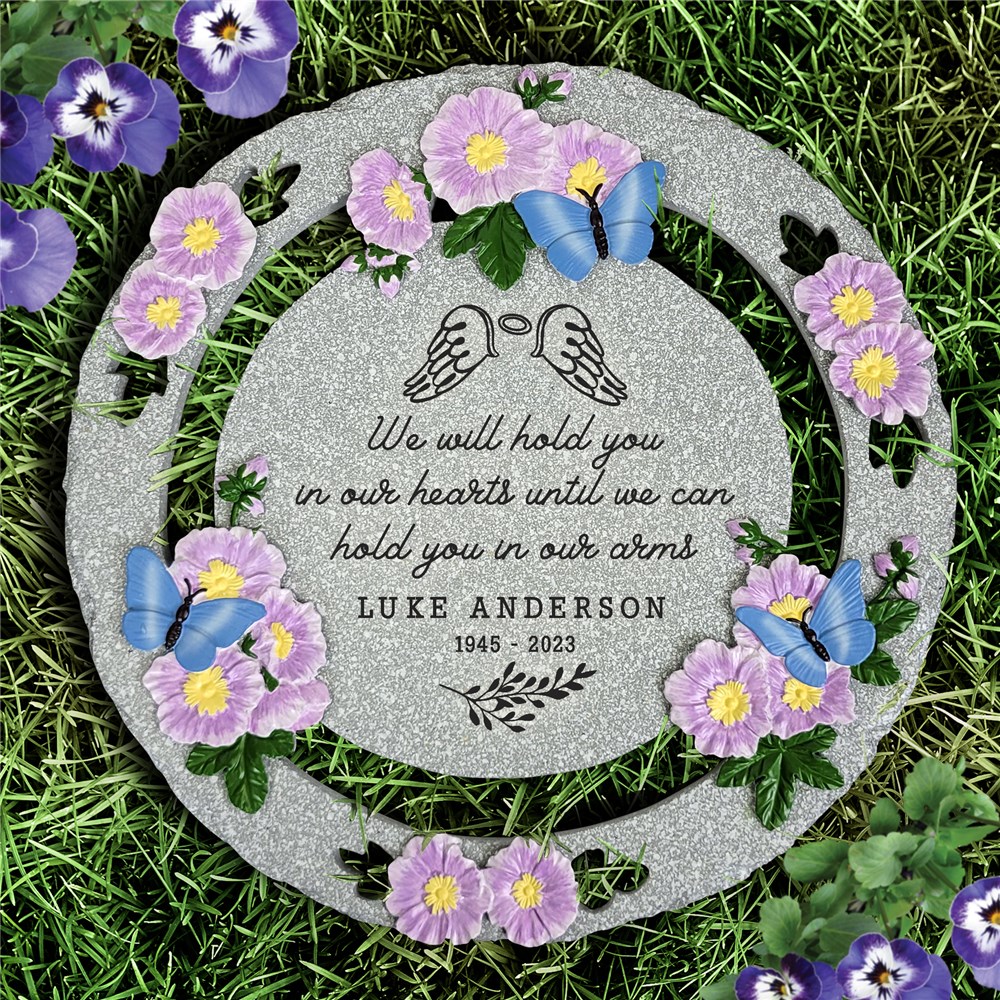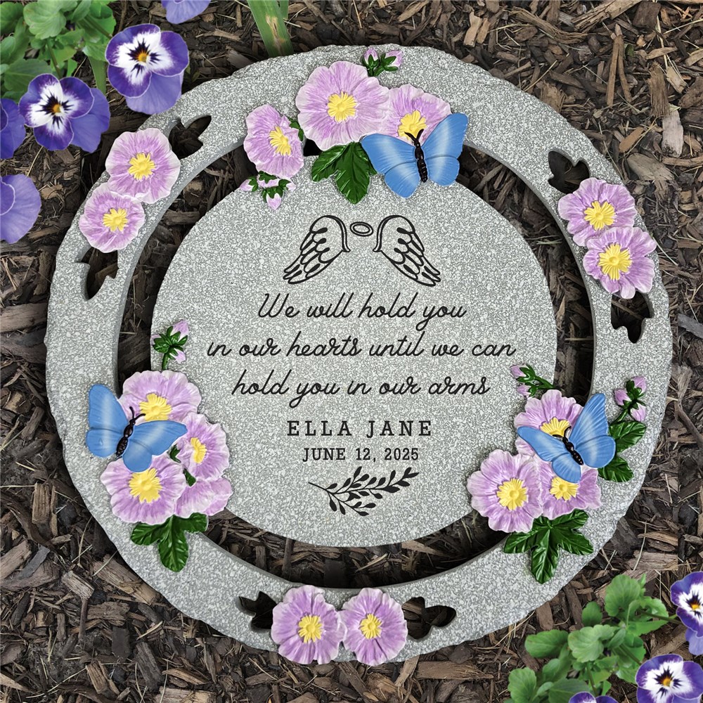 This delicately designed garden stone is adorned with soft floral accents and gentle butterflies, symbolizing innocence, peace, and love. Personalize it with the baby's name and a meaningful date to create a cherished keepsake for remembrance. A beautiful tribute that brings comfort and a lasting reminder of the love that remains.