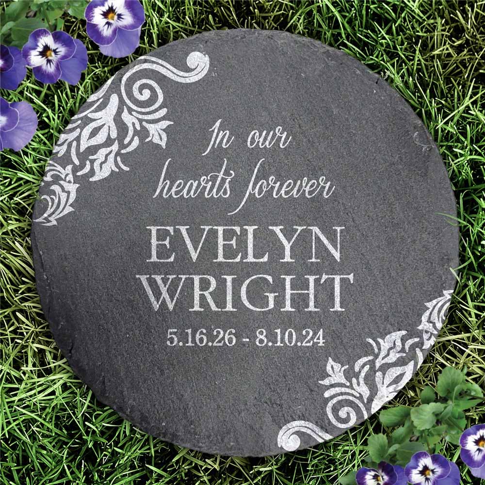 You can honor a loved one who has passed when you place our beautiful Engraved In Our Hearts Forever Round Slate Stone in your yard. Beautifully personalized in loving memory of your lost friend, family member, or loved one, this beautiful piece is a lovely way to pay tribute to someone who is no longer with you. We will engrave any first name, last name and memorial years.