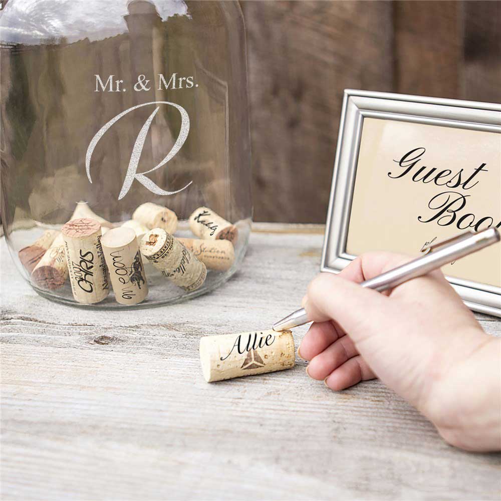 Our Engraved Initial with Names Glass Growler serves as a unique guest book for any wedding.