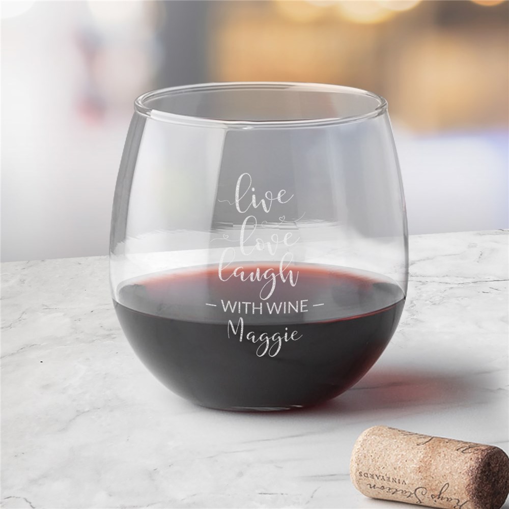 Our Engraved Live Love Laugh Stemless Red Wine Glass is a cute way to enjoy your favorite wine.