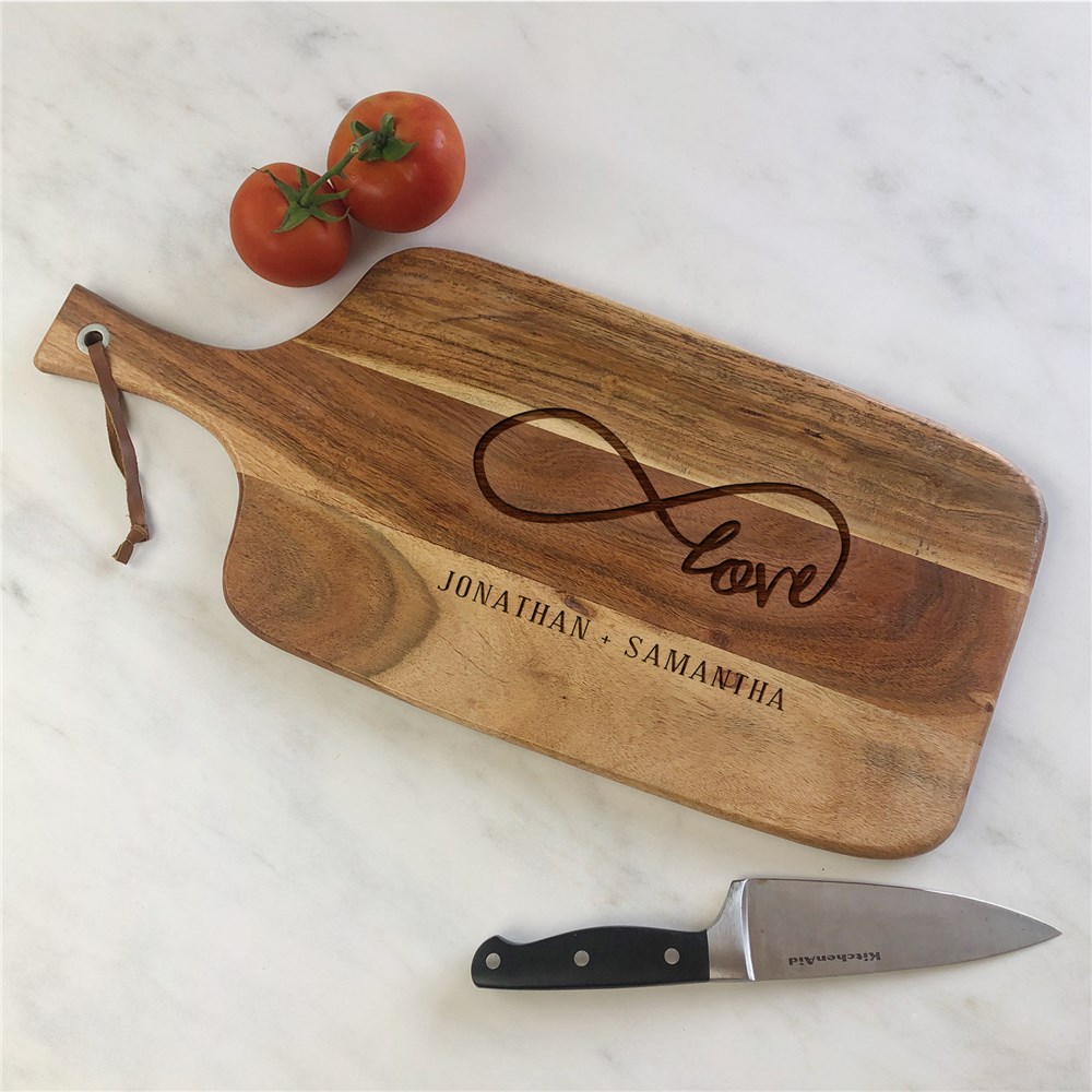 Make cooking together romantic using our Engraved Love Infinity Acacia Paddle Cutting Board.