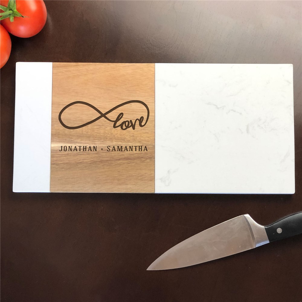 Couples who enjoy entertaining or cooking together will appreciate our Engraved Love Infinity Marble and Acacia Wood Serving Board.