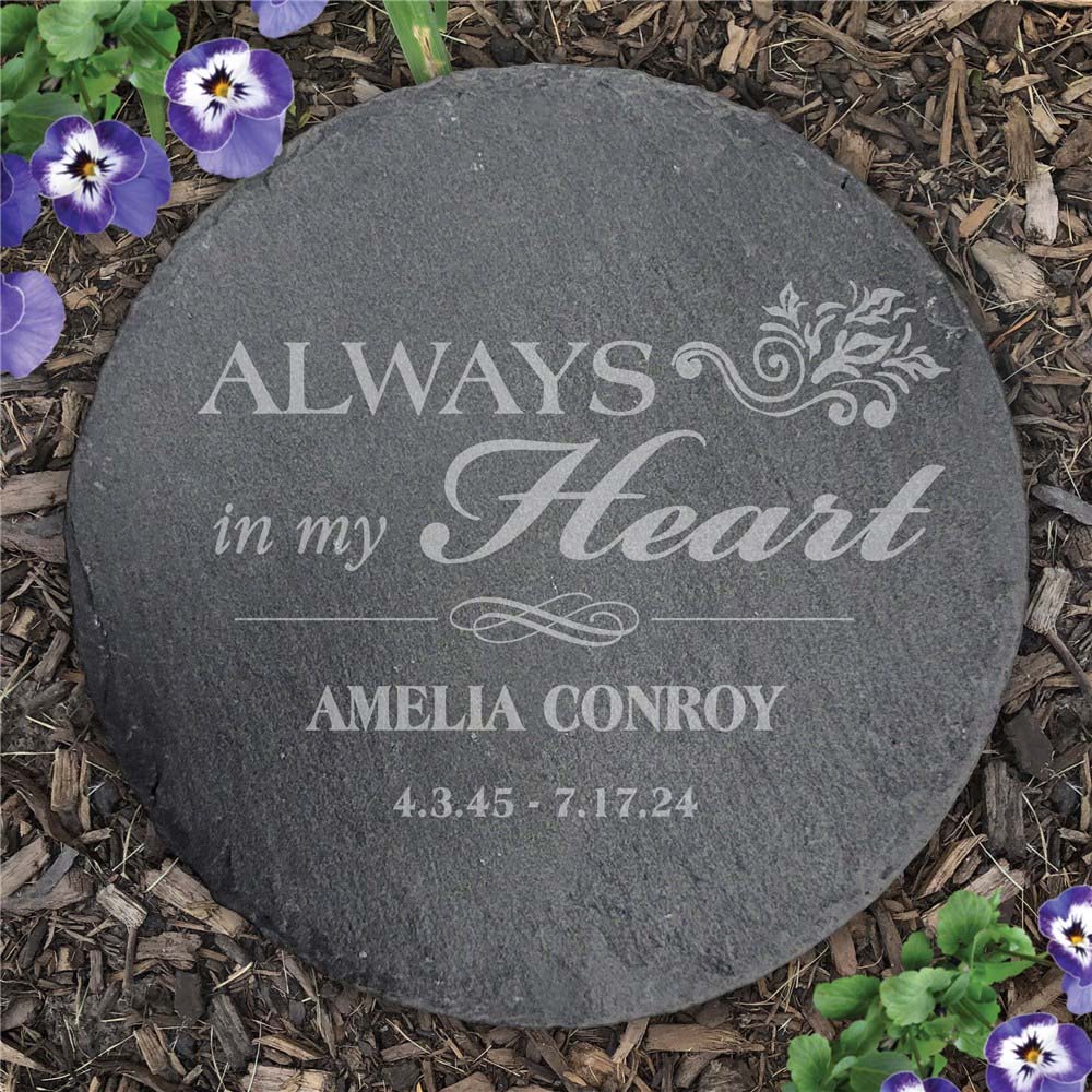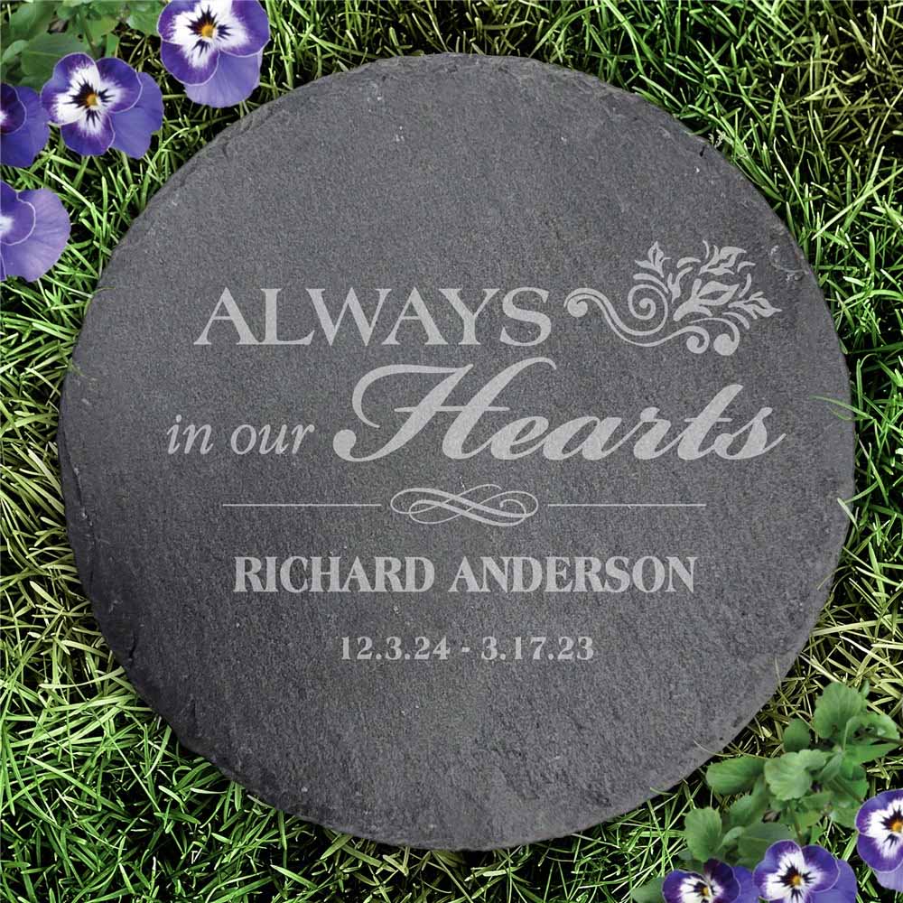 Remember a loved one with this Engraved Memorial Round Slate Stone n you yard.  Free personalization of any name and memorial dates are included.