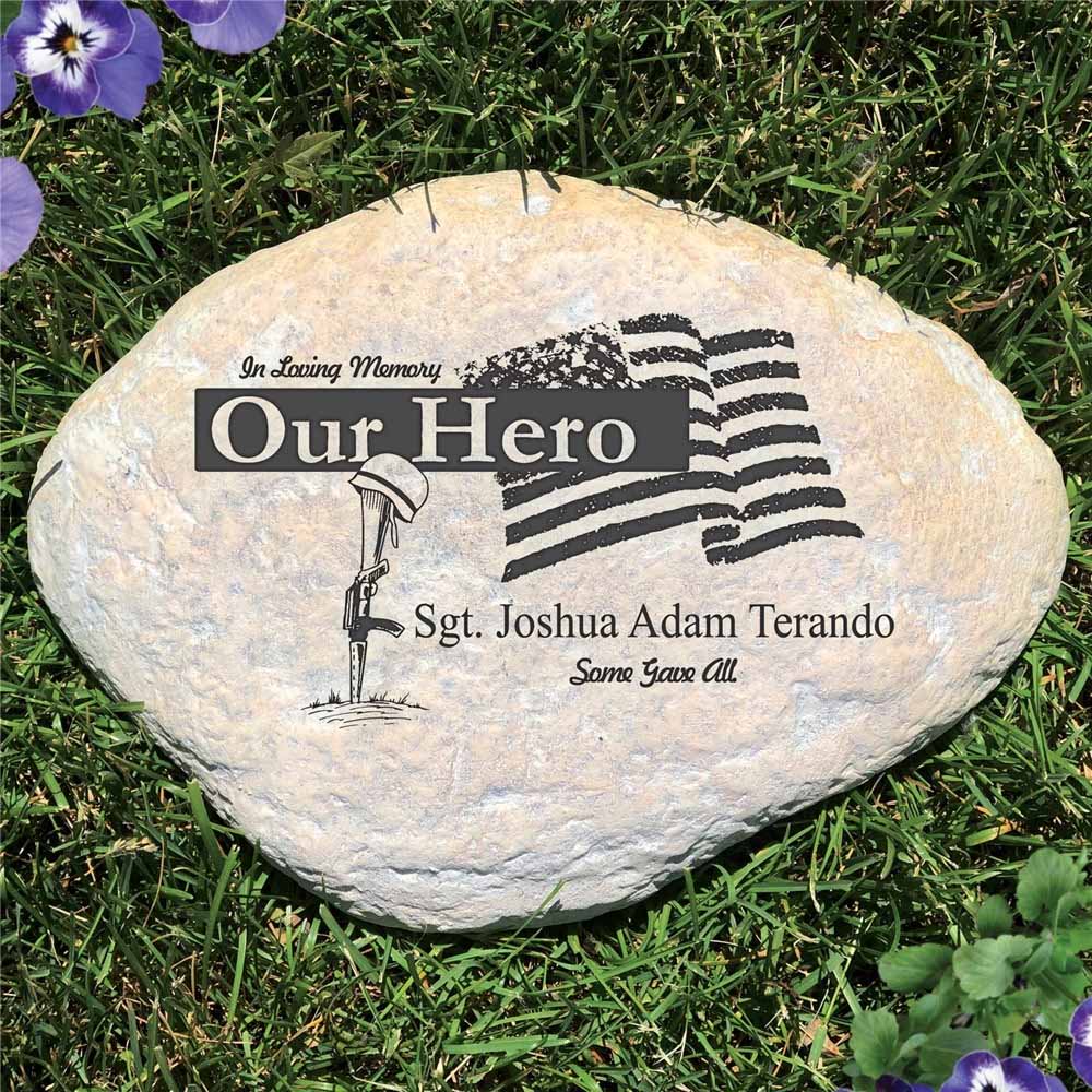 Honor your loved ones who served our country well with our new Engraved Our Hero Garden Stone. This heart warming garden accent features our American flag with our heroes war gear and allows space for your caring words. Personalize your Garden Stone with any name.