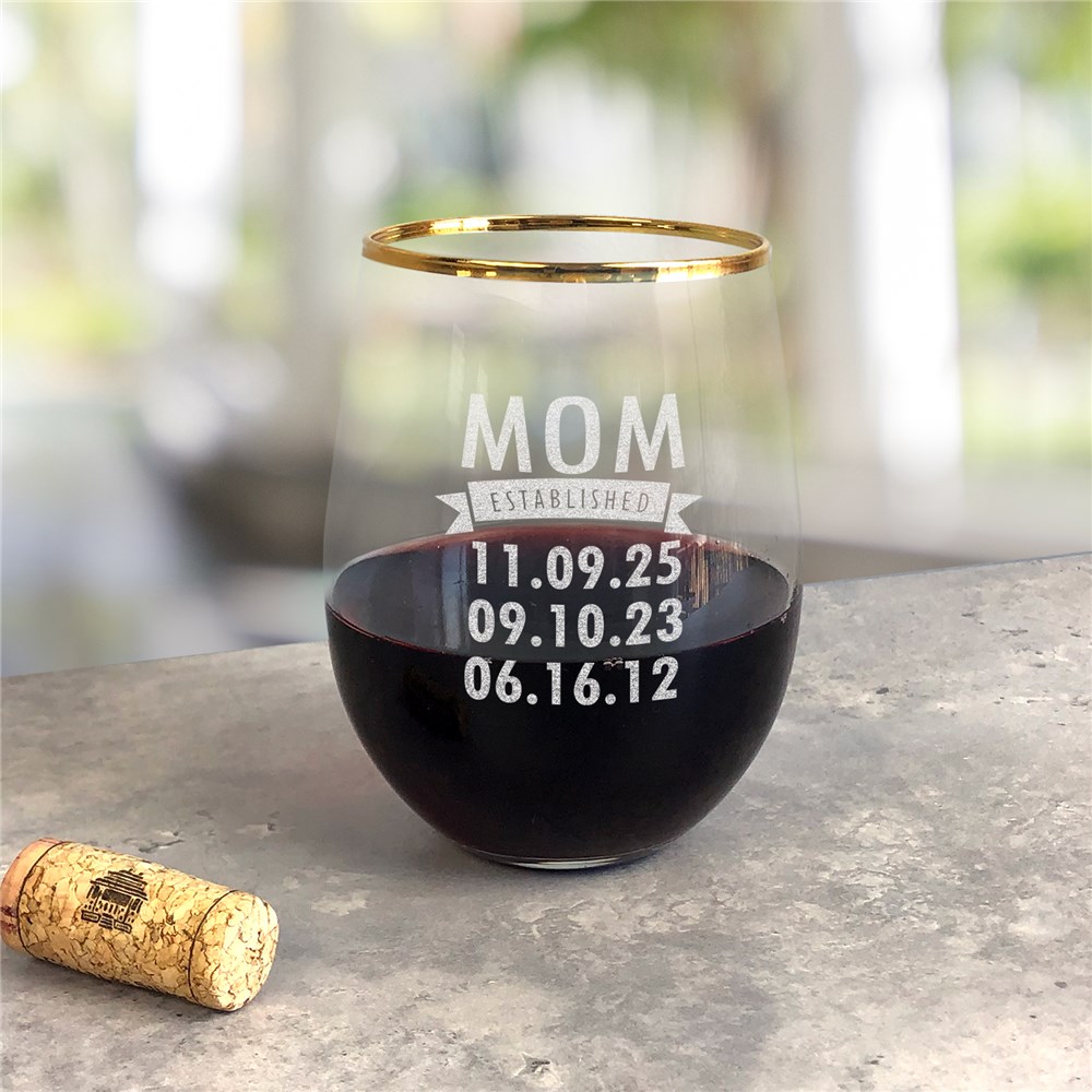 Engraved Mom Established Stemless Wine Glass with Gold RimEngraved Mom Established Stemless Wine Glass with Gold Rim