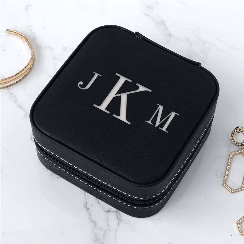 This leatherette jewelry case can be personalized with 3 initials for a must have travel essential.