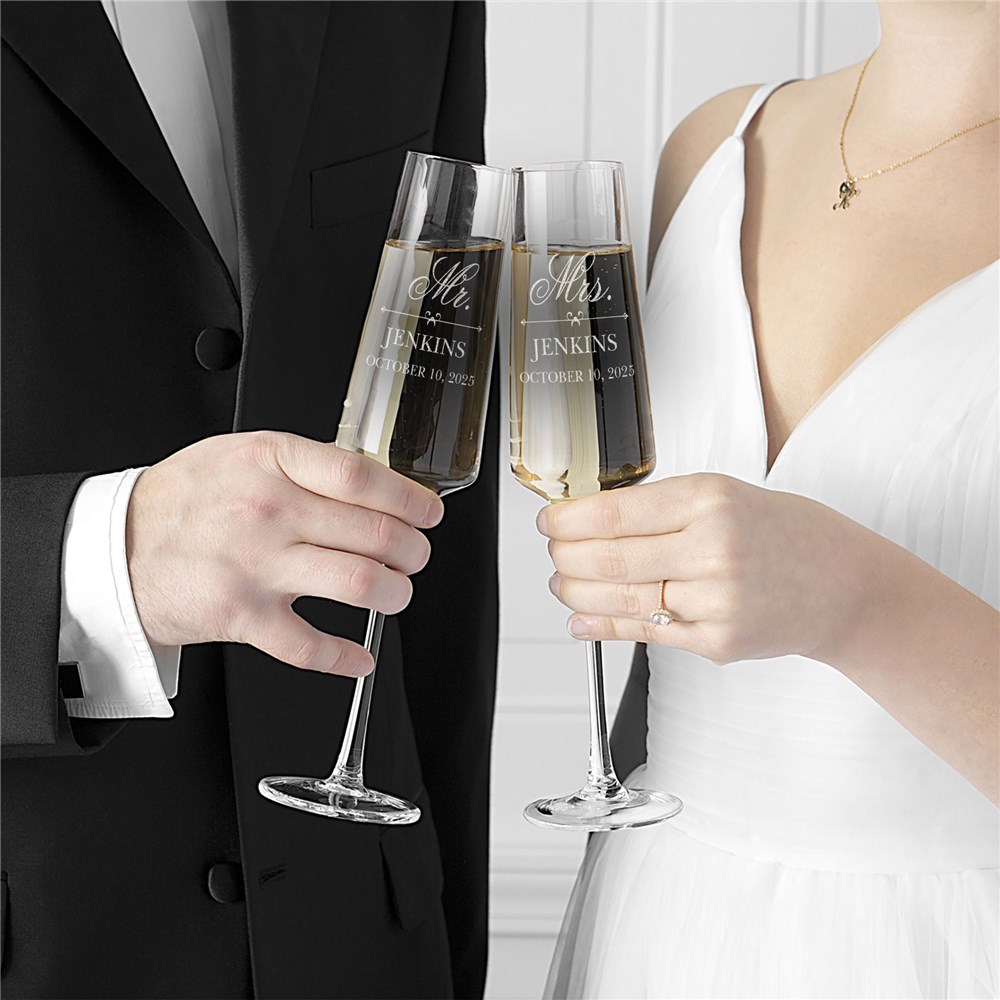 Toast to a new chapter in life with your soulmate using our Engraved Mr. and Mrs. Champagne Estate Glasses Set!