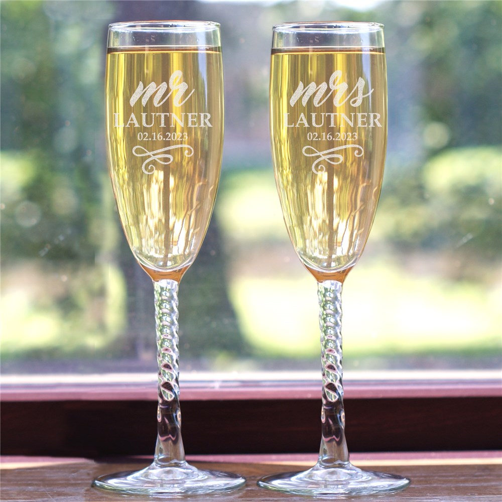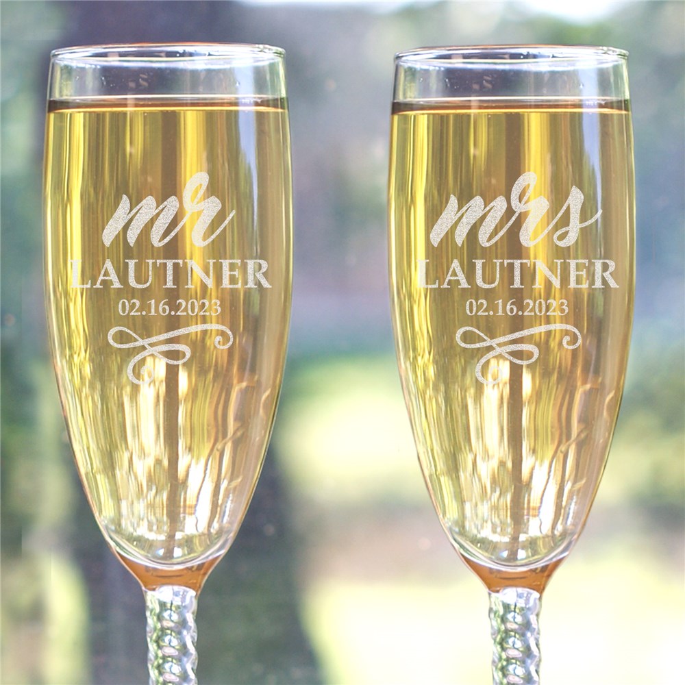 Engraved Mr. and Mrs. Wedding Gold Rim Champagne Flutes