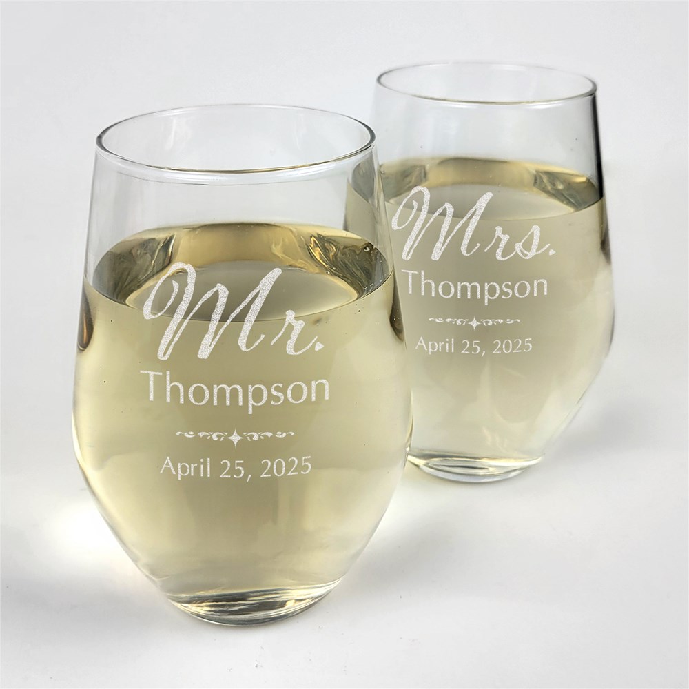Engraved Mr. And Mrs. Wedding Contemporary Stemless Wine Glass Set