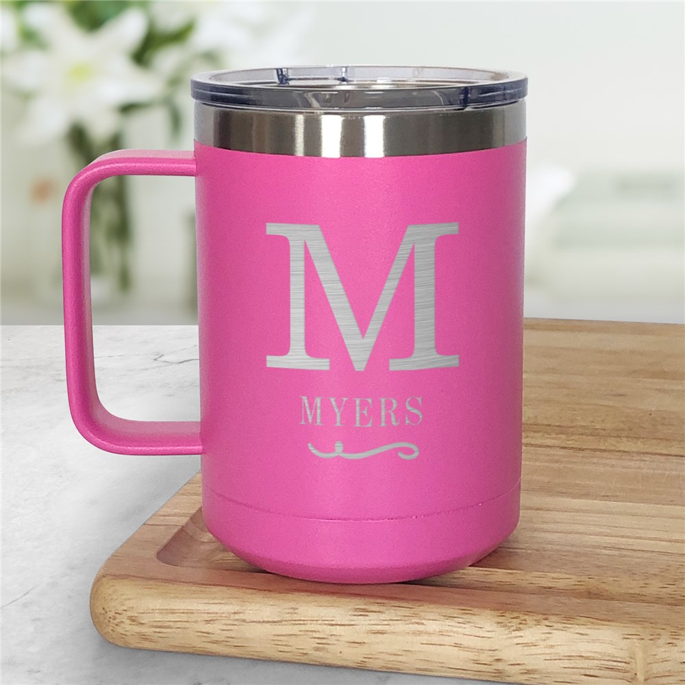 Our Engraved Name And Initial Flourish Insulated Mug is great for bringing a drink with you on the go.