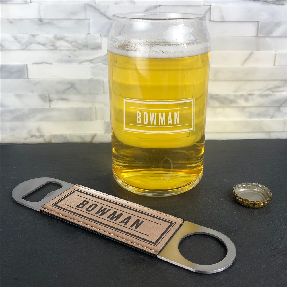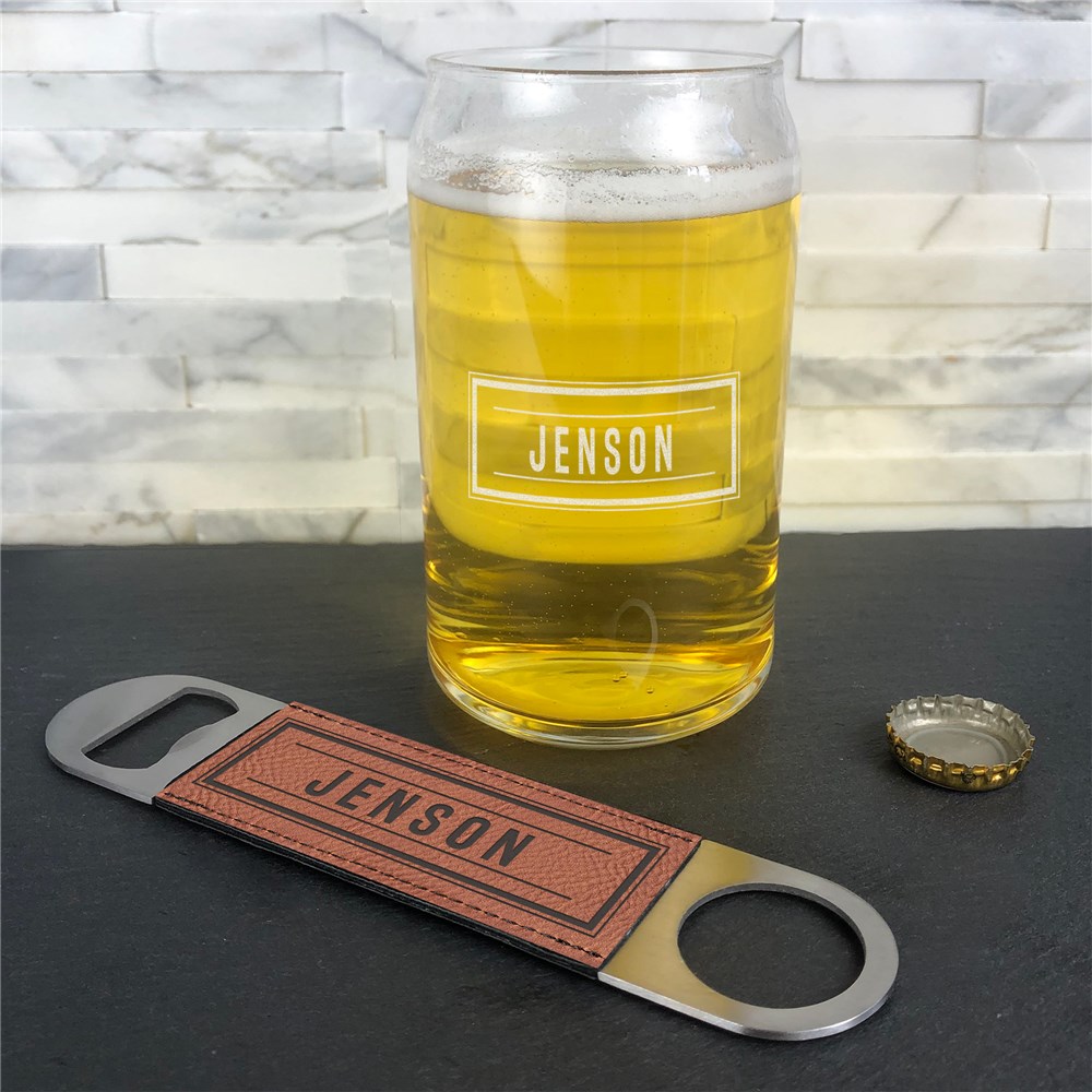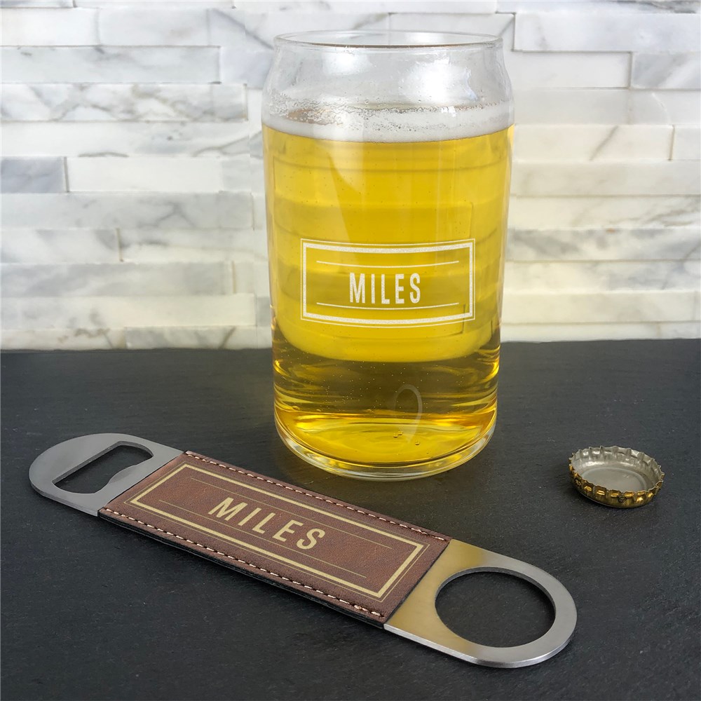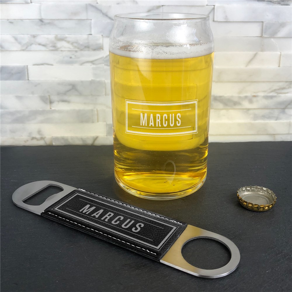 This 2 piece set includes a leatherette bottle opener and beer can glass; both can be personalized with any name.