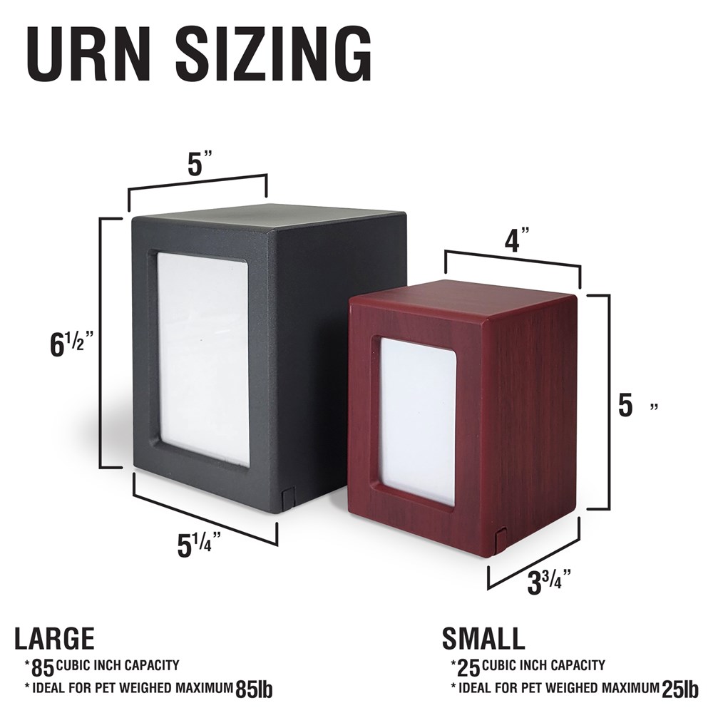 • Size large: 85 cubic inch capacity - ideal for a pet that weighed a maximum of 85 lbs. Holds a 4.75"H x 3.5"W photo Outer dimensions - 6.5"H x 5.25"L x 5.0"W.