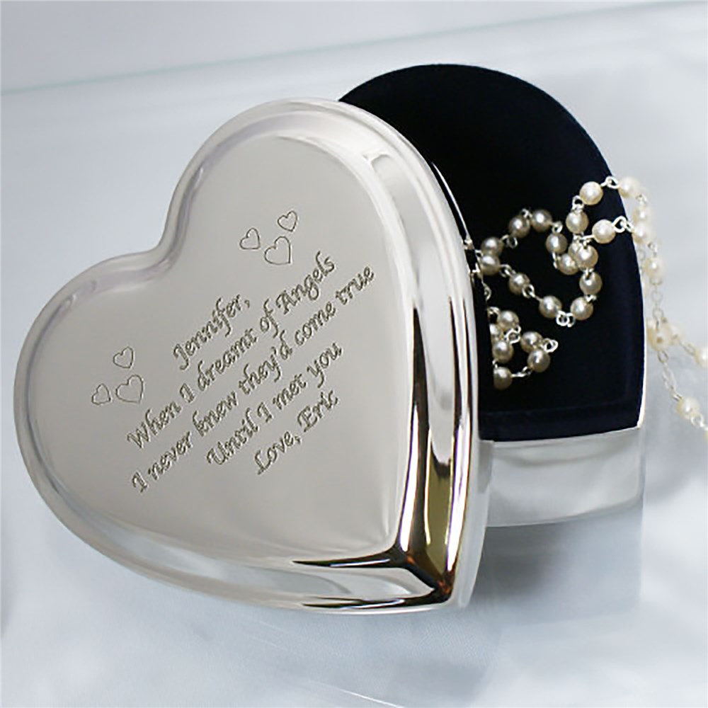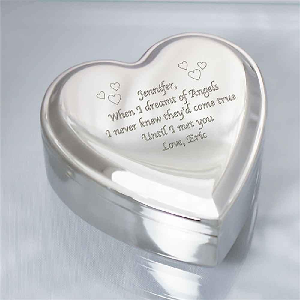 This beautifully engraved silver heart box is the perfect present for the love of your life. It's excellent for Valentine's Day, her birthday or any day you want to make special! Your personalized heart jewelry box will be exquisitely engraved with your five-line custom message to make this truly a one-of-a-kind gift. The keepsake box with custom message is a heart-shaped jewelry box with a silver-plated removable top, and the interior features a soft, blue felt to protect her precious jewelry. It's the perfect gift to show her that she has your heart.