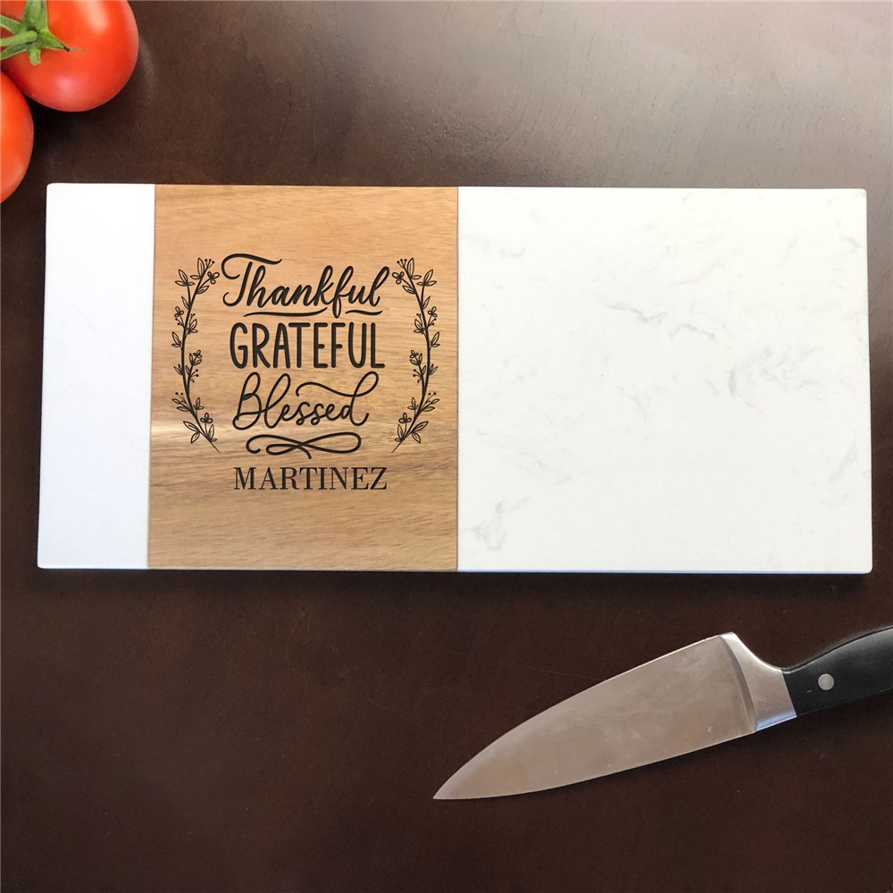 Engraved Thankful Grateful Blessed Marble & Acacia Wood Serving Board