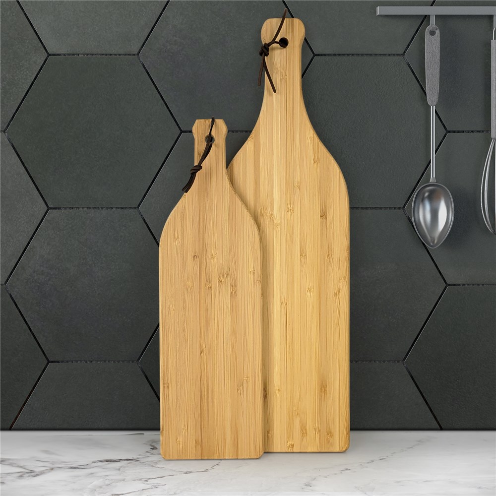 We will personalize this bamboo wine bottle shaped board with any name and any custom message line to make a custom item you will love to display and use in your kitchen.