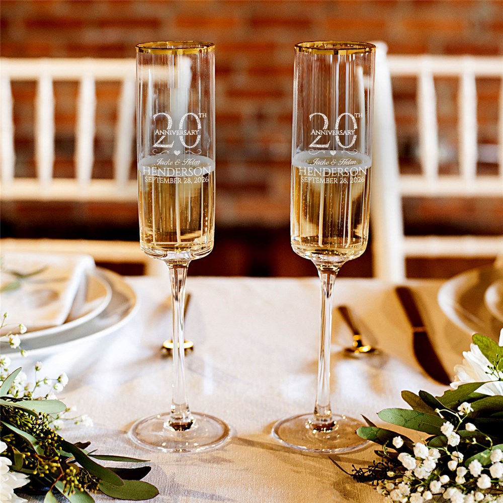 Toast to all the years you've spent together and all the years to come with our Engraved Wedding Anniversary Gold Rim Champagne Flutes.