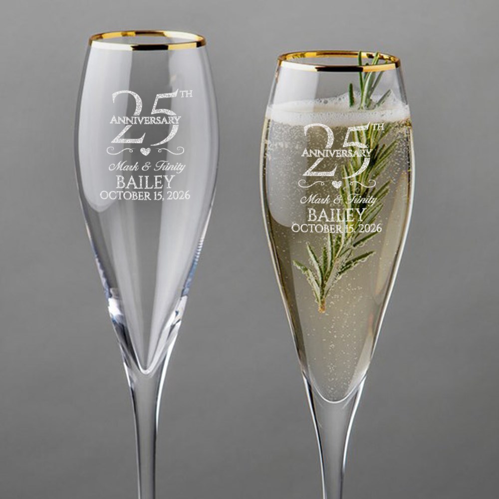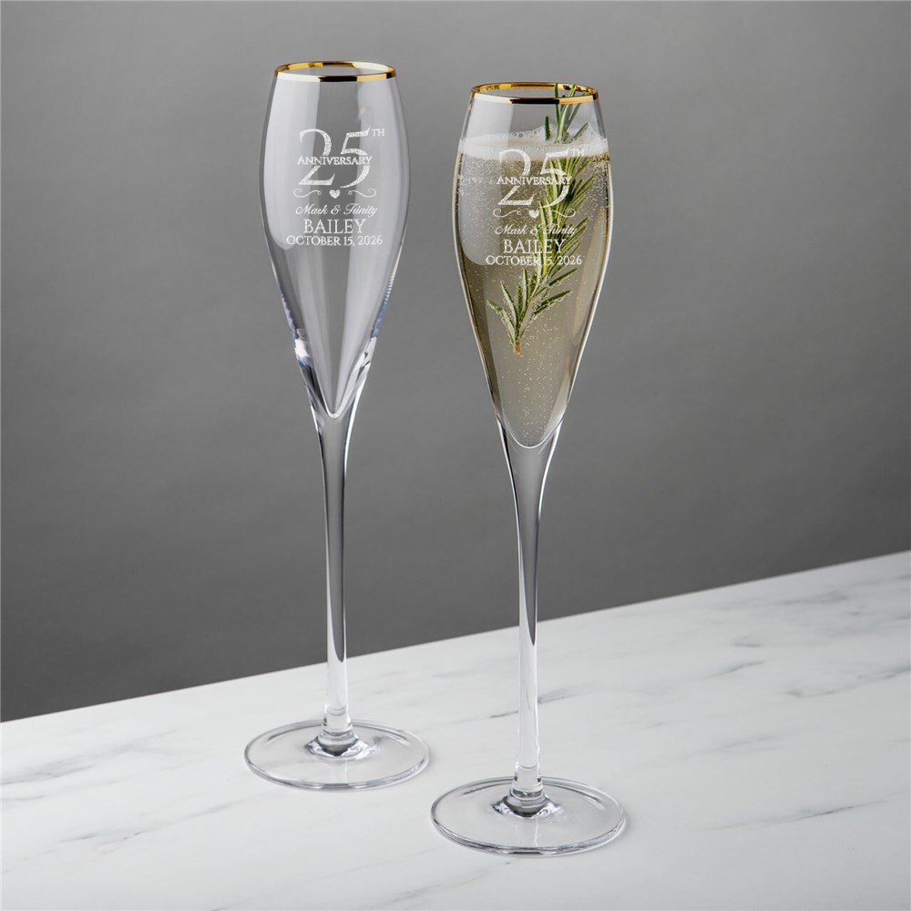 Look back on all the years and memories you've shared with your soulmate while celebrating your anniversary with our Engraved Wedding Anniversary Gold Rim Tulip Champagne Flute Set.