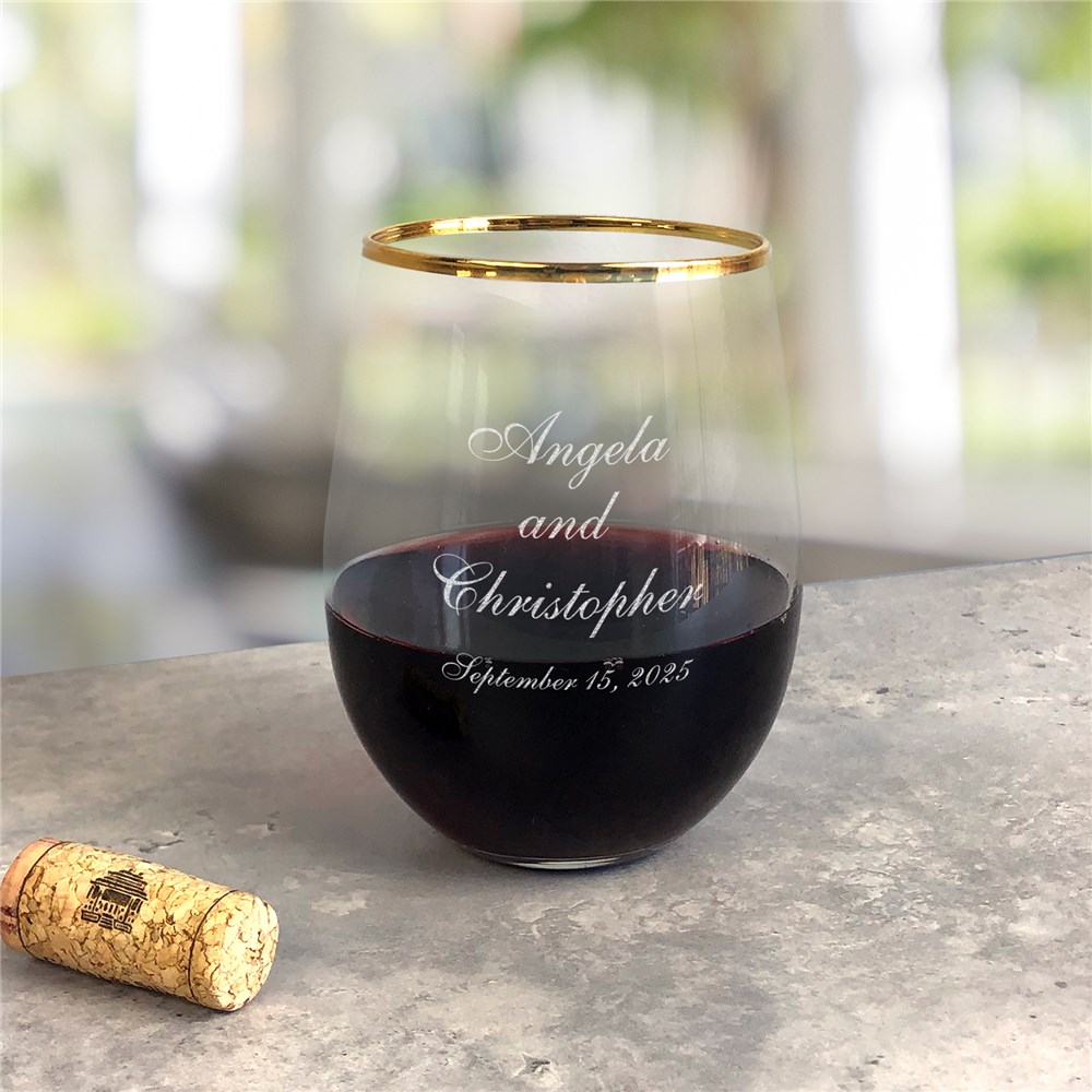 Newlyweds will enjoy a glass of wine together using our Engraved Wedding Couple Gold Rim Stemless Wine Glass.