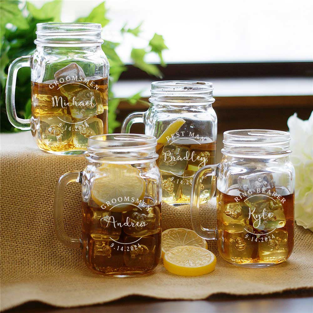 Additional Details Masons jar mugs with handles are even cooler when they're personalized for you! Check out all of our great customized glassware for your home bar or as a wedding or housewarming gift.