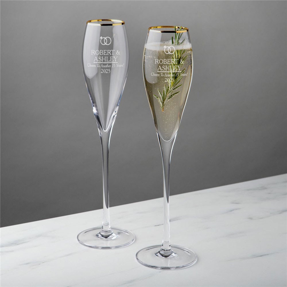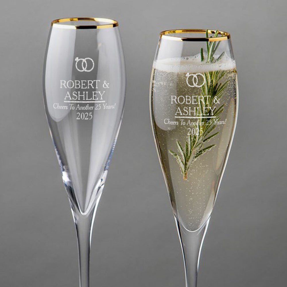 Couples will have a great time celebrating a wedding or anniversary with our Engraved Wedding Rings Gold Rim Tulip Champagne Flute Set.
