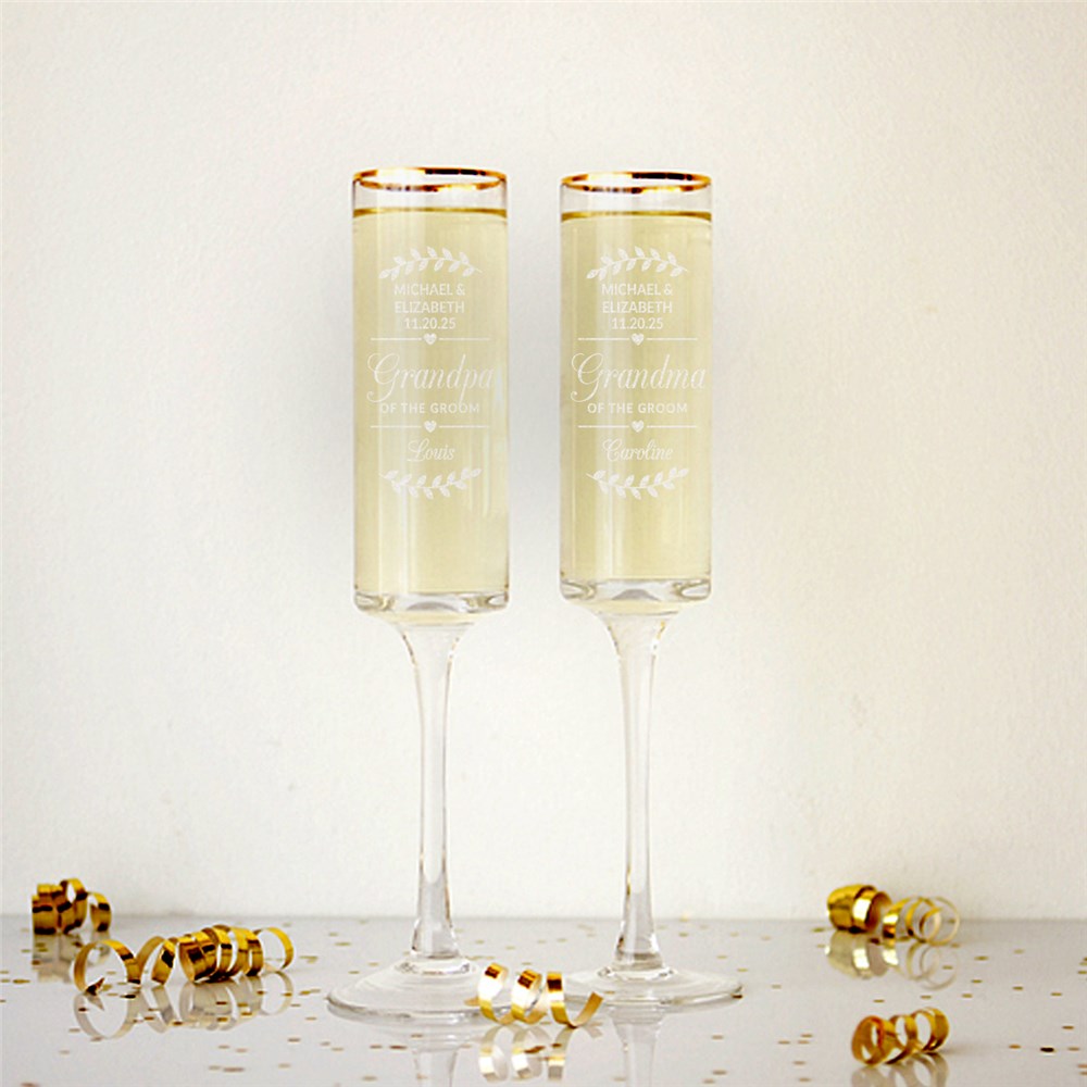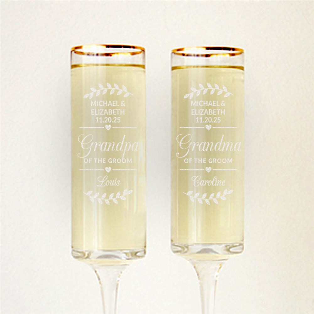 Create a cute flute set for the mother, father, grandma or grandma of the bride of groom with this Engraved Wreath Extended Wedding Party Gold Rim Champagne Flute Set.