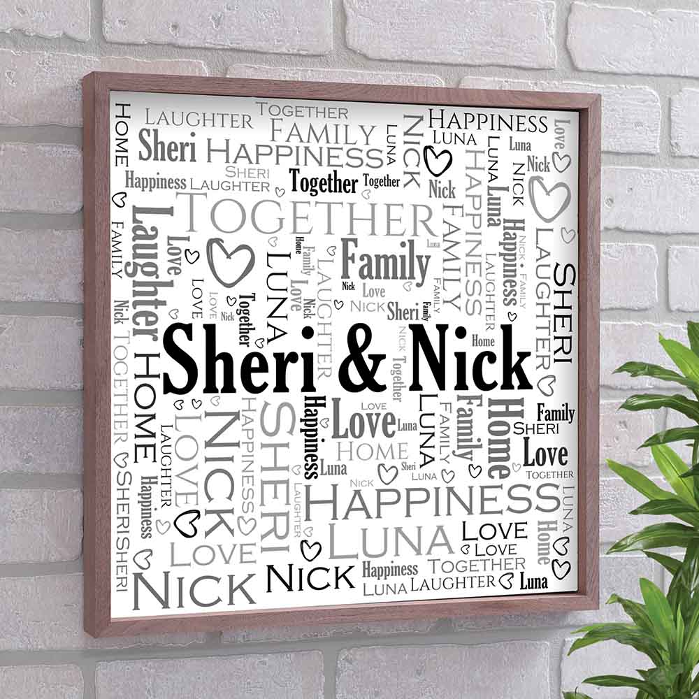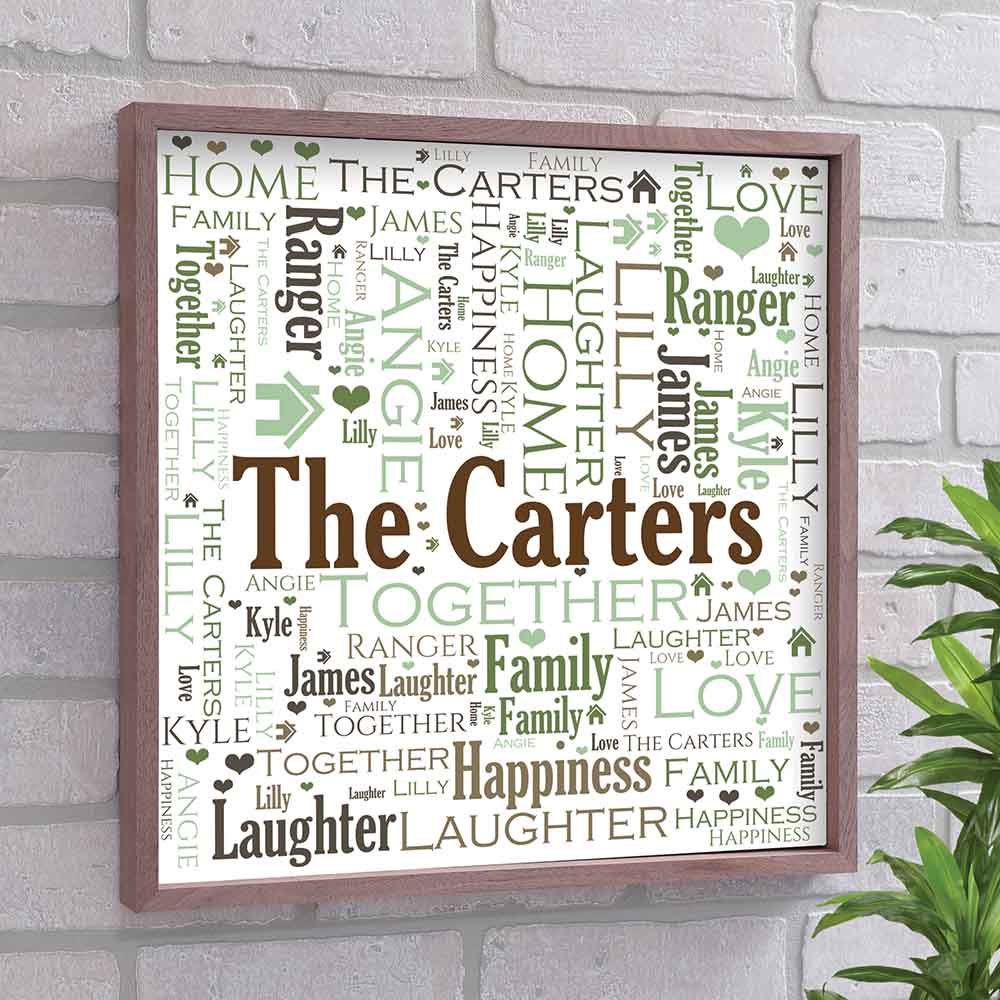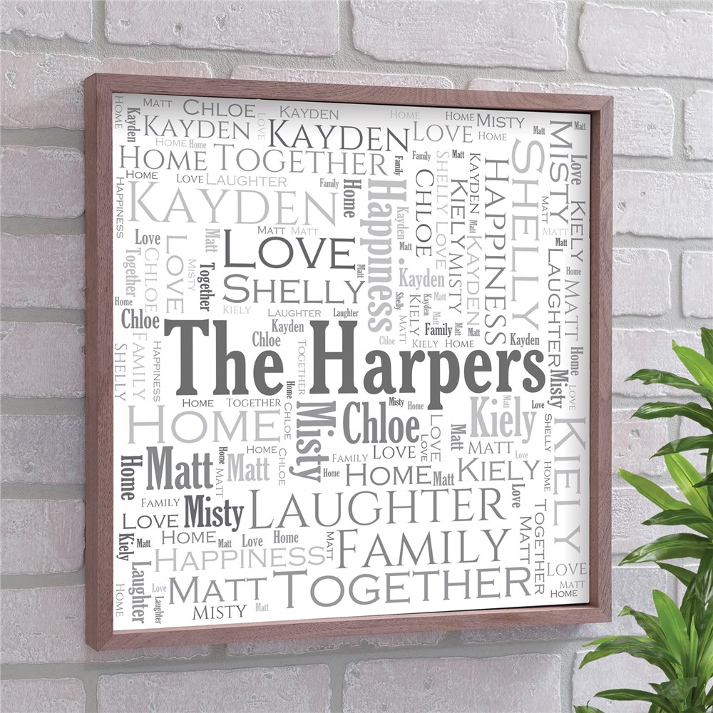 Create a unique item to hang in your home with our Family Name Word Art Framed Wall Sign.