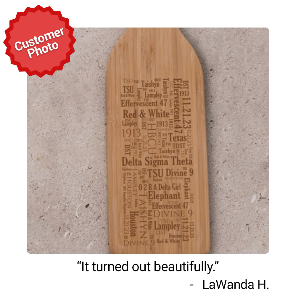Please note that the personalization is engraved directly into the bamboo board. There is no color fill so the color of the engraving will vary with the natural color variations of the bamboo.