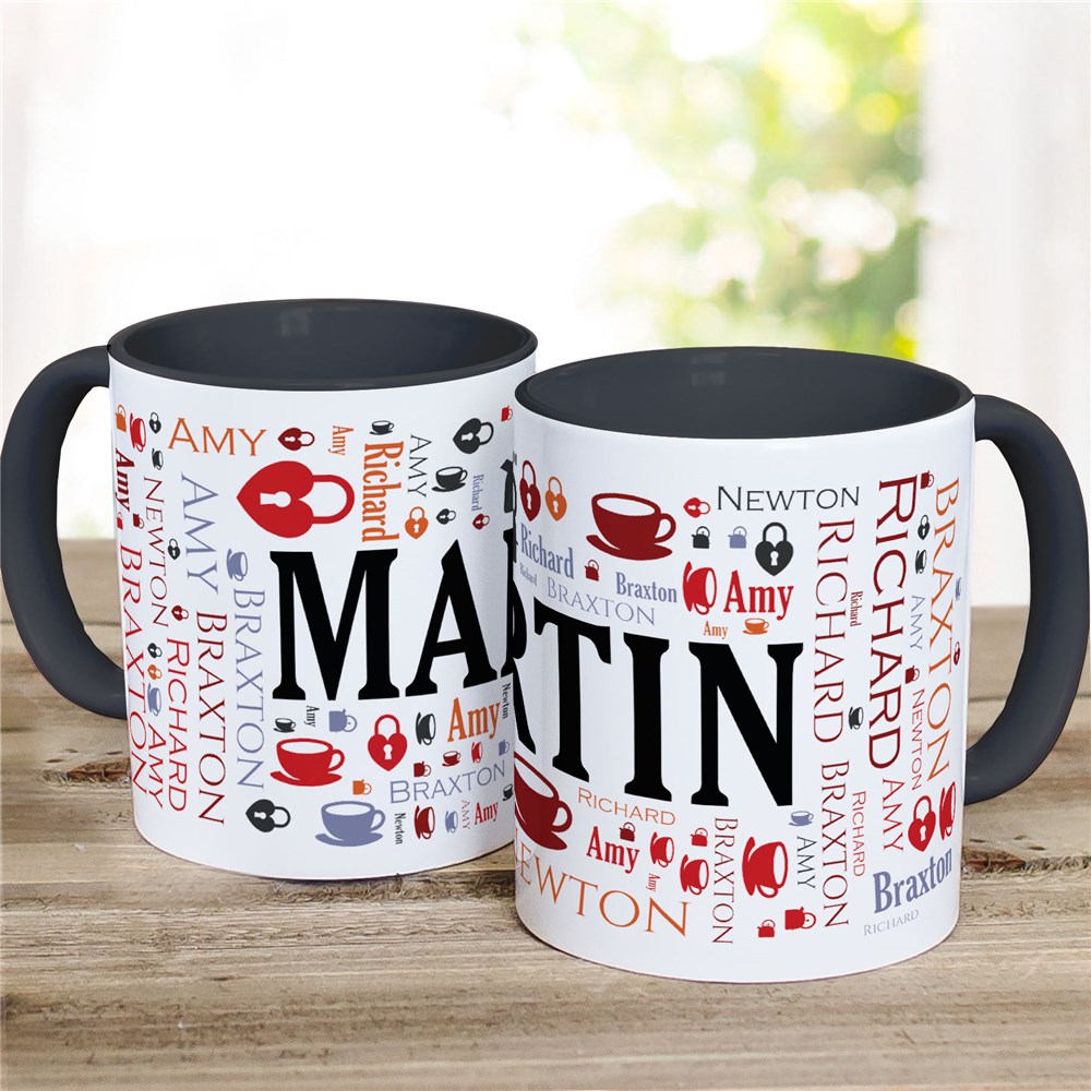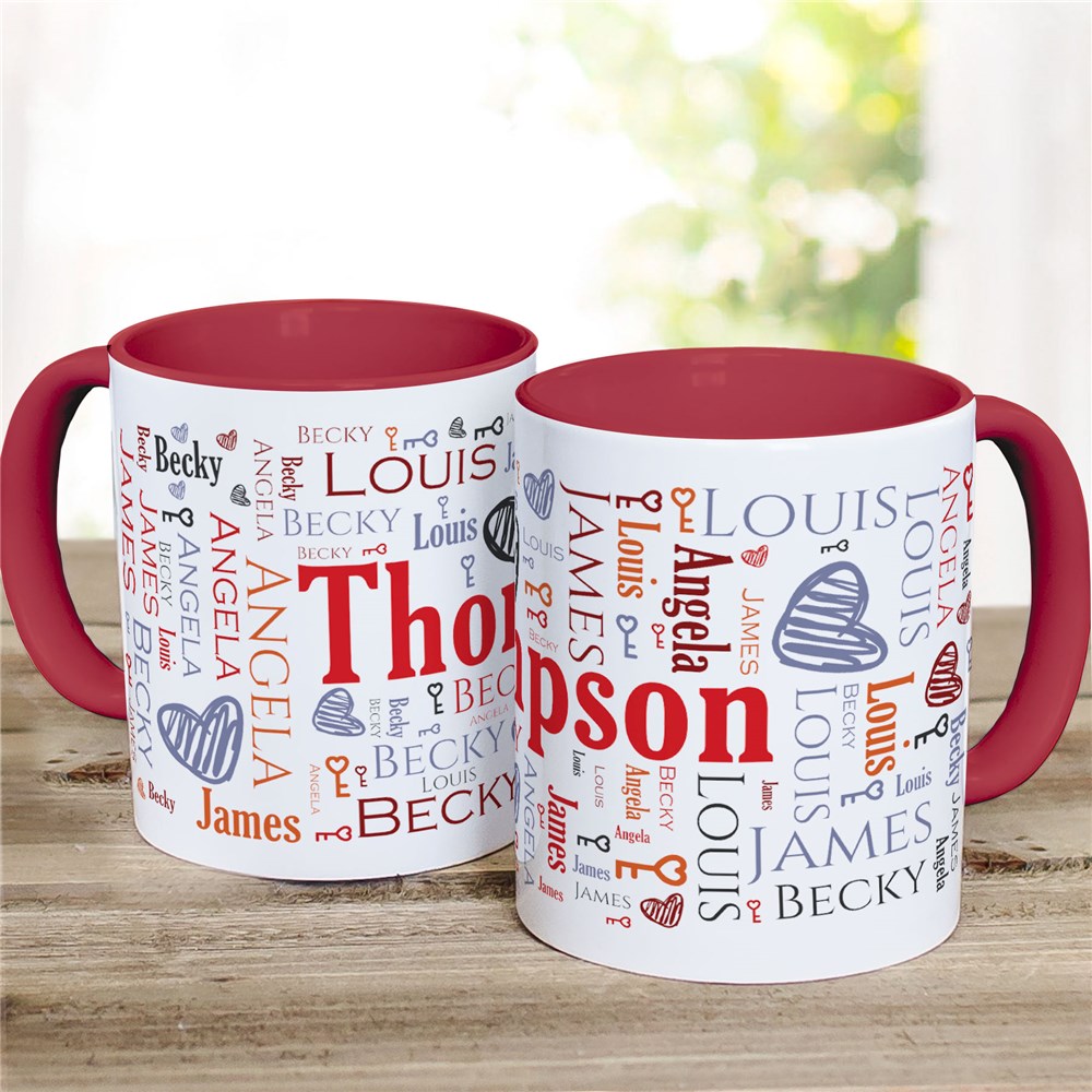 Surprise Dad, Mom, Grandpa, or any other family member with word art customizable coffee mugs that show off their inner circle of family members. Choose from Black, Red or Blue handled mug. This design is unique and creative, making it a one of a kind gift coffee lovers will cherish.