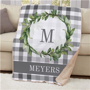 .Personalized Plaid Eucalyptus Wreath Sherpa Blanket
