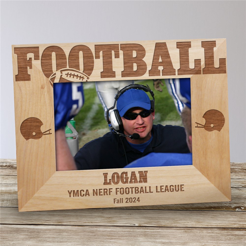 A picture of your football team looks great in these Football Personalized Wood Picture Frames. Our Personalized Football Photo Frame makes a unique gift idea for any football team or coach. Our Personalized Wooden Picture Frames come in three sizes, please choose from, 4"x6", 5"x7" and 8"x10". Includes an easel back allows for desk display. Engraved football gifts include FREE Personalization! Personalize your Football Photo Frame with any name, and two line custom message.