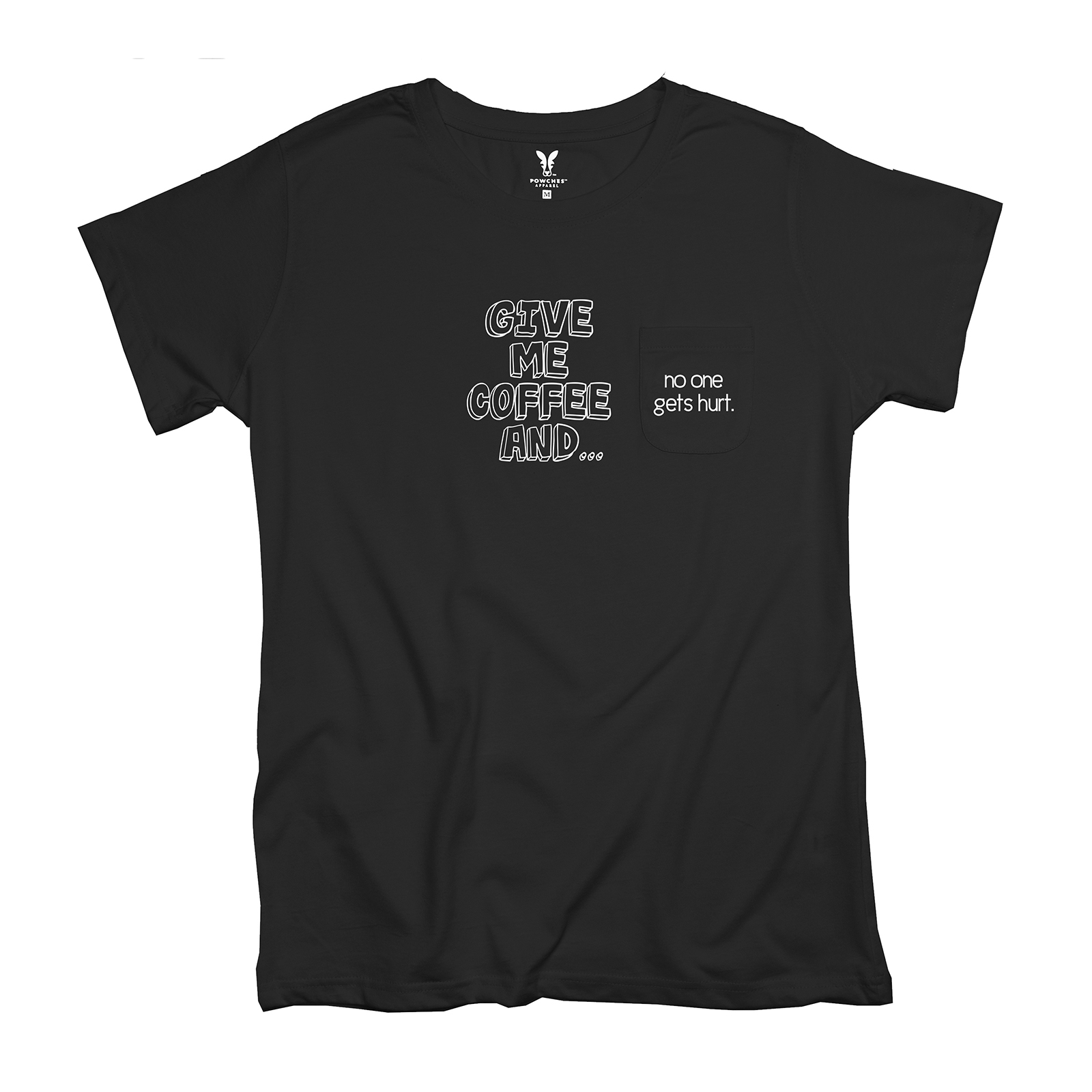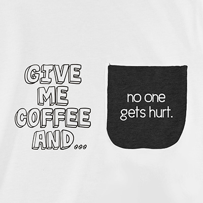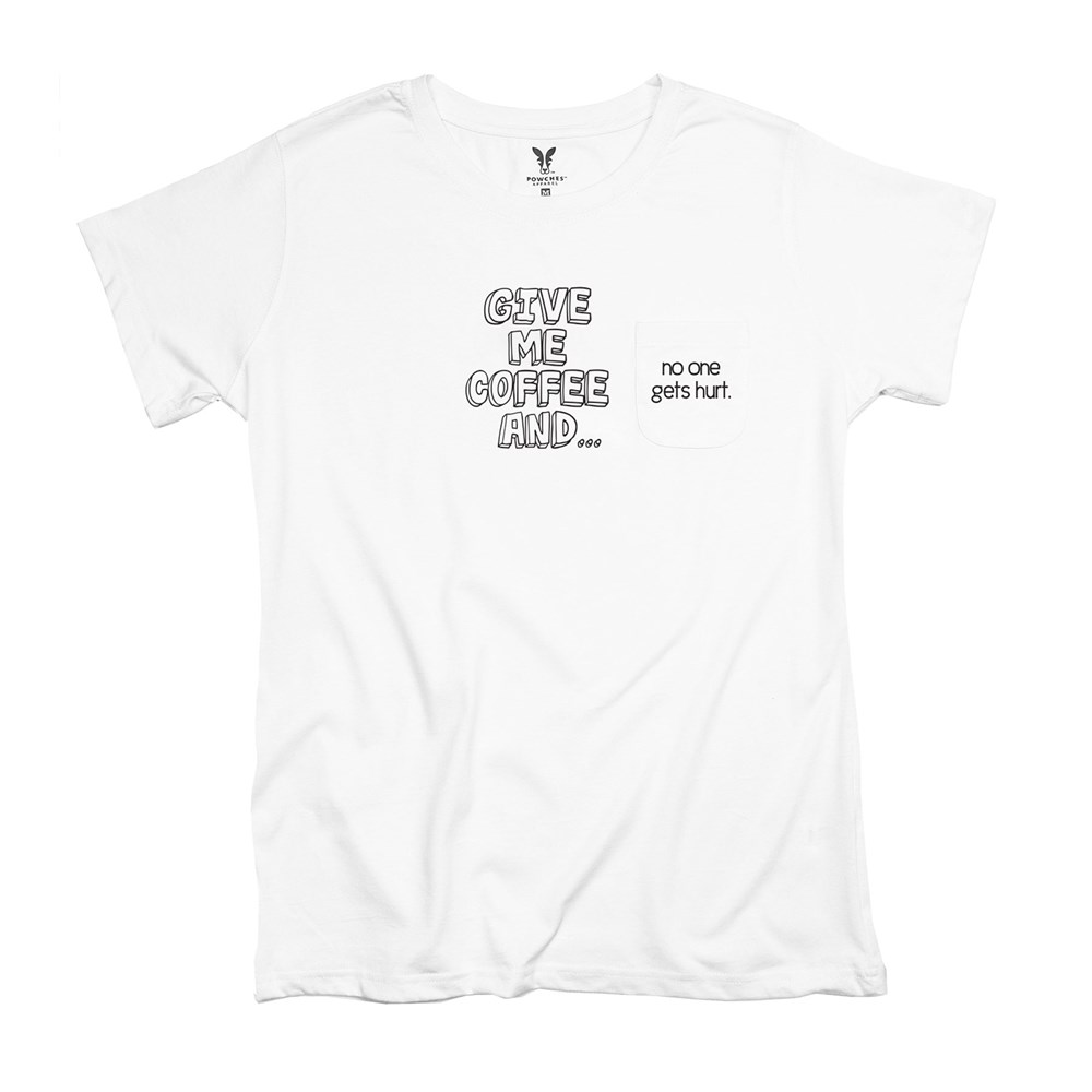 Additional Details Do you need to start off your day with coffee or someone might get hurt? This Give Me Coffee Ladies Pocket T-Shirt will be perfect for you. Each shirt features our unique design with the punchline on the pocket!