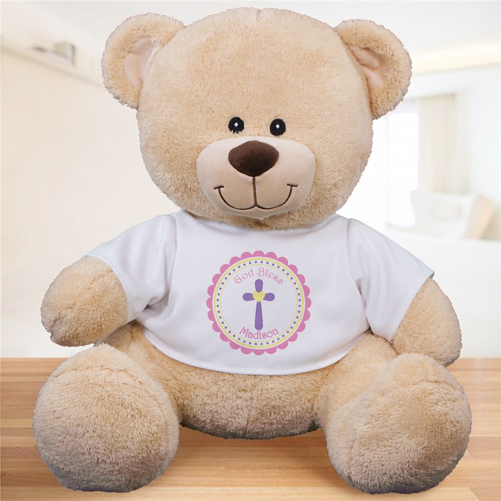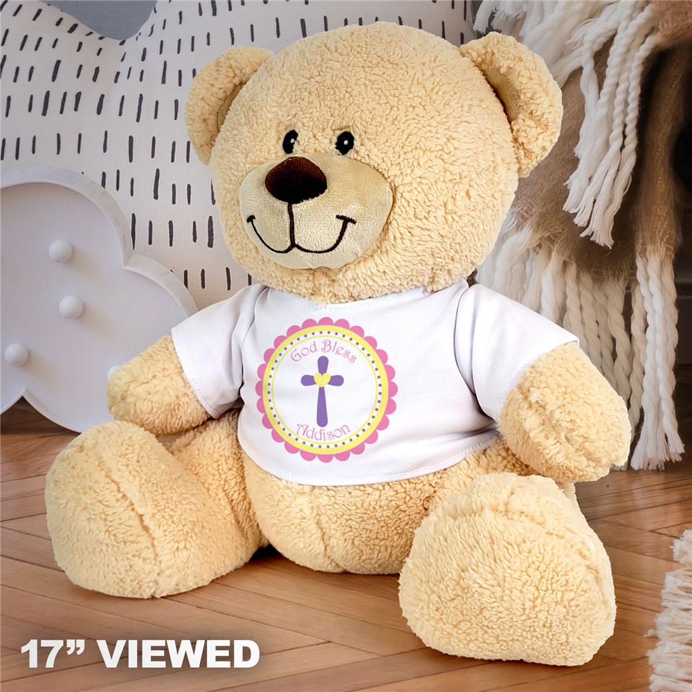 Whether you're celebrating a First Communion, a Christening, or any special day, this wonderfully soft and cuddly personalized God Bless teddy bear is a gift that is sure to become a treasured friend for life. This adorable Sherman teddy bear is wearing a t-shirt that features a cross in purple, pink and yellow colors and will be personalized to say God Bless your child's name (up to 12 letters). This custom God Bless stuffed animal has an irresistible look on his face and contrasting tan fur on the inside of his ears and snout, and he comes in three great sizes: 11, 17" and 21" (gift box available for 11" only). Shop our selection of personalized baptism gifts and christening keepsakes today.