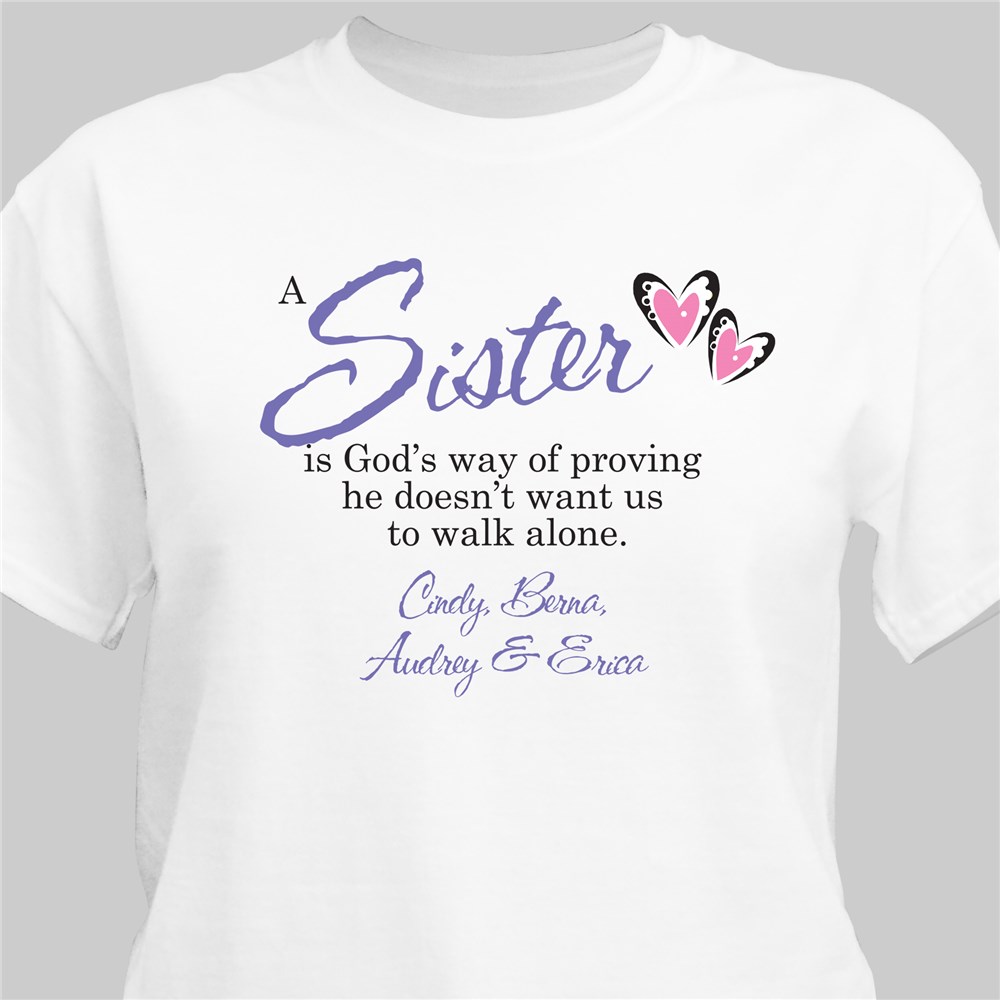 Our Personalized Sisters T-Shirts feature the finest quality tee shirts and custom printing. Your Sisters will love to wear these Personalized Sister T-Shirts Select one for each of your sisters. These pesonalized sisters shirts make excellent gifts for your sisters on Sister's Day, Family reunions or just a special girls day out.