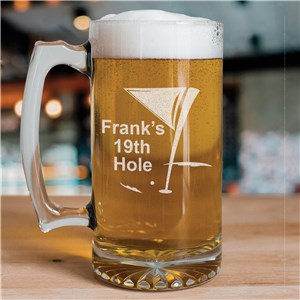 Sit back, relax and knock back a cold brew after your best round of golf and drink from this Engraved Golf Glass Mug. This Personalized 19th Hole Glass Mug is a great accessory for any man cave, home bar or game room. Each mug makes the perfect gift for your fanatical golfer and an excellent Father’s Day Gift idea. Personalize your mug with any name. (ex. Frank's)