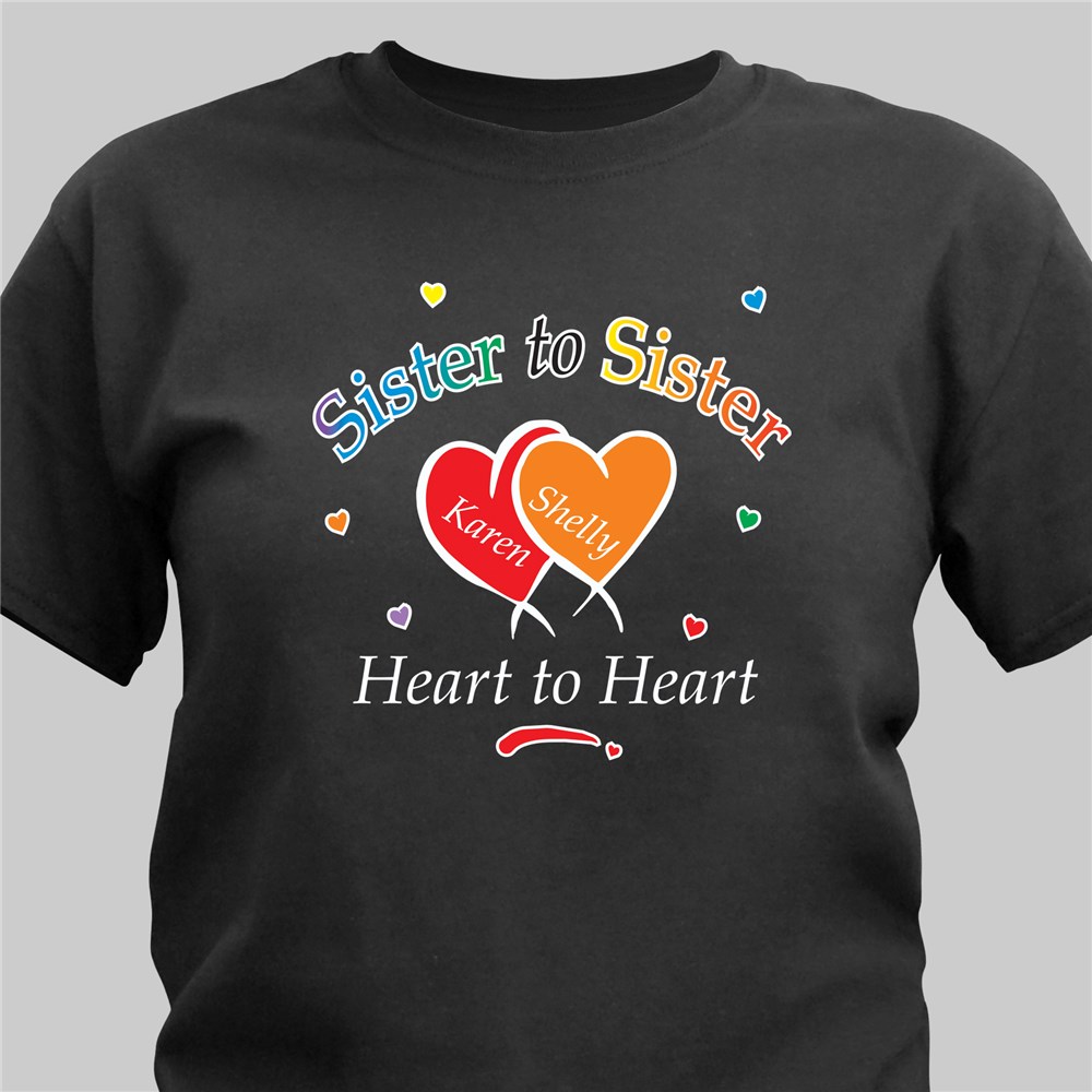 Give Sisters Personalized T-Shirts to the one person who knows you better any anyone, you sister. Each Personalized Heart to Heart Sisters T-shirt is a wonderful way to display the love you have for each other. Our Personalized Sisters T-Shirt is available on our premium white 100% cotton Personalized Shirt, machine washable in adult sizes S-3XL. Sisters shirts include FREE personalization! Personalize your Sisters gift t-shirts with up to 6 Sisters names. Each sisters name will be personalized on their own heart.