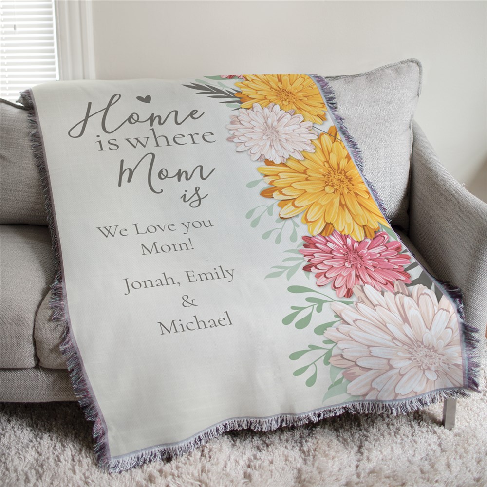 This Home Is Where Mom Is personalized afghan throw is a beautiful afghan for Mom to use and display all year round.