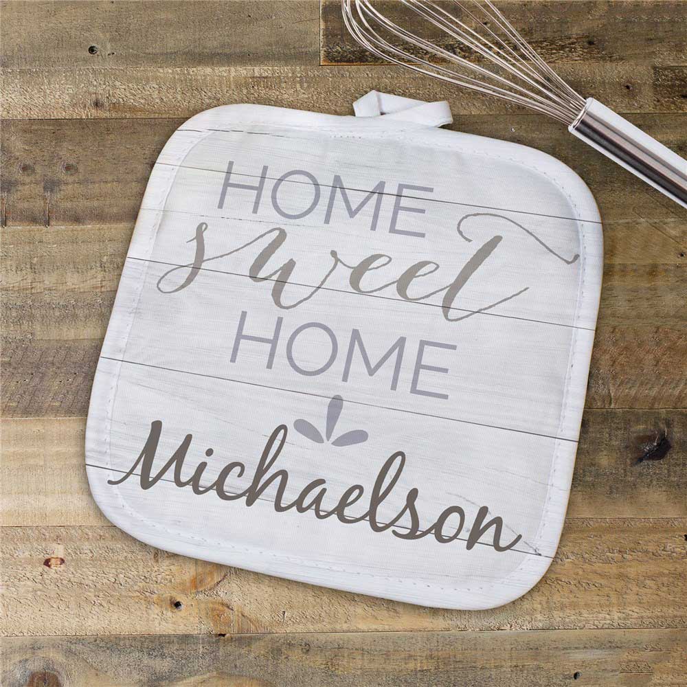 Whether you love to cook at the stove, grill or oven, be sure to always look great doing so with your new Personalized Home Sweet Home Pot Holder.This hot pad is ready at a moments notice for keeping your hands and counters safe from the heat.